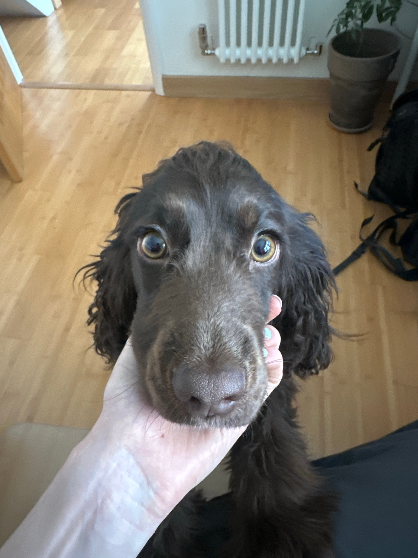 An indoor scene in Wealden, United Kingdom, captured from a slightly high angle, features a dark brown, medium-sized dog positioned centrally, looking directly forward. A pale human hand, exhibiting l…read more