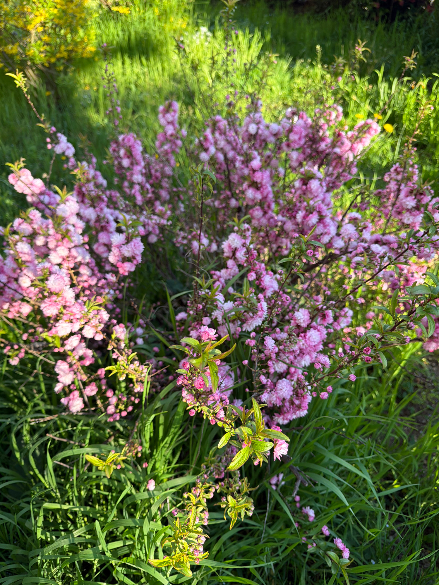 A medium shot depicts a profusion of pink flowers against a backdrop of lush green grass. The flowers appear to be clustered on a bush or small tree, filling the left and center portions of the frame.…read more