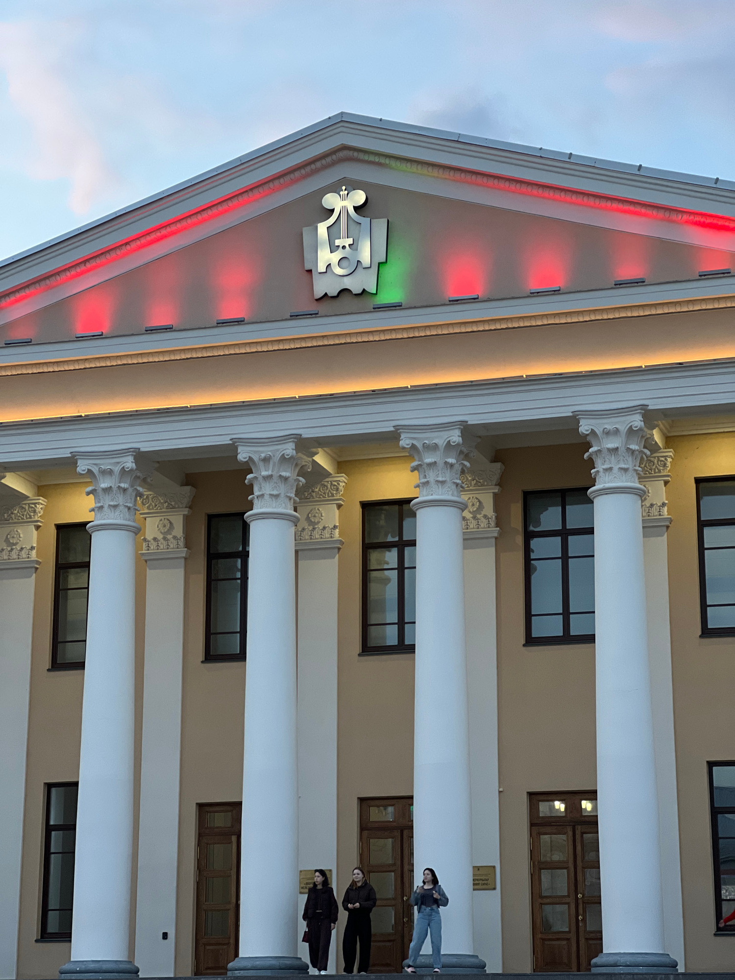 The image depicts a building facade in Kazan, Russia, specifically the Saydashev State Grand Concert Hall. The building features classical architectural elements including a pediment with red and gree…read more