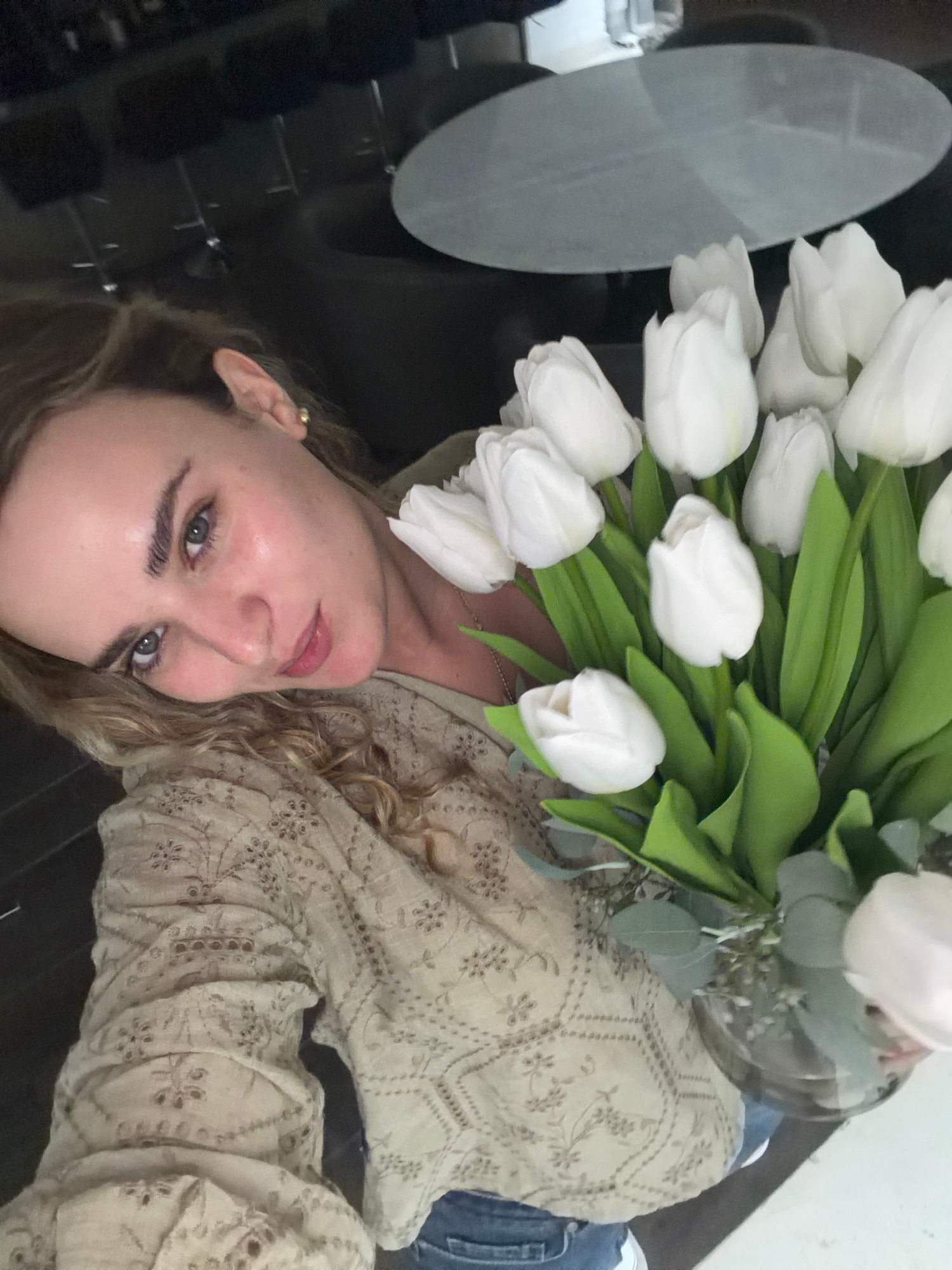A woman is holding a bouquet of white tulips in front of her face. She is wearing a light brown embroidered shirt and blue jeans. She is sitting on a black surface, likely a table or countertop, and t…read more