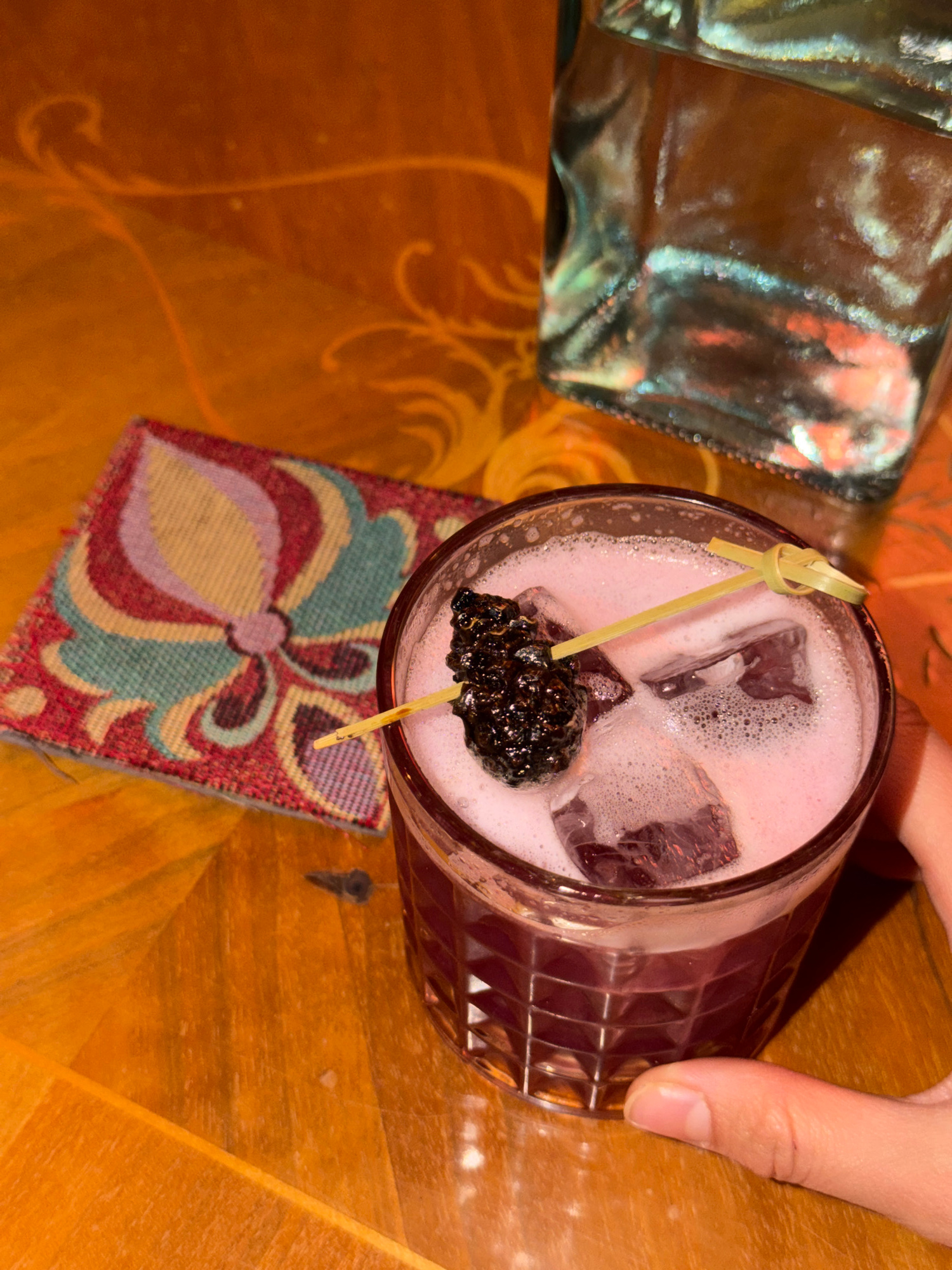 This image, captured in Krasnoyarsk, Russia, shows an overhead view of a hand holding a cocktail glass. The cocktail itself is a vibrant pink or light purple, topped with a frothy layer and containing…read more