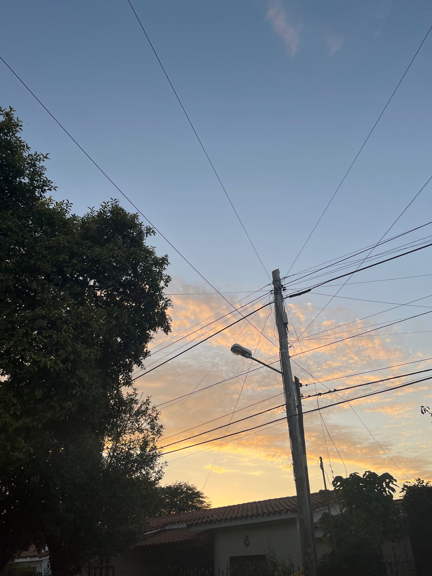 The image captures a view looking upwards towards a utility pole. Power lines are strung across the sky, crisscrossing the image. The sky is divided into a light blue on the left and a golden, cloud-f…read more