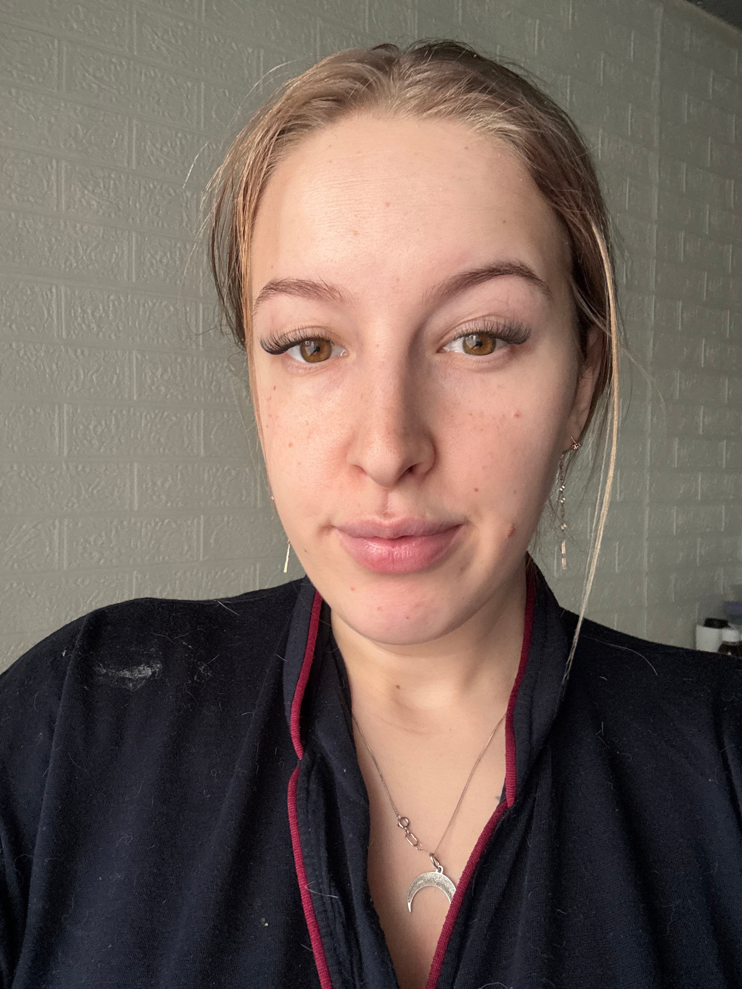 A close-up portrait of a young woman with fair skin, freckles, and light brown hair. She has light brown eyes with prominent eyelashes, and is wearing a silver necklace with a crescent moon pendant. S…read more