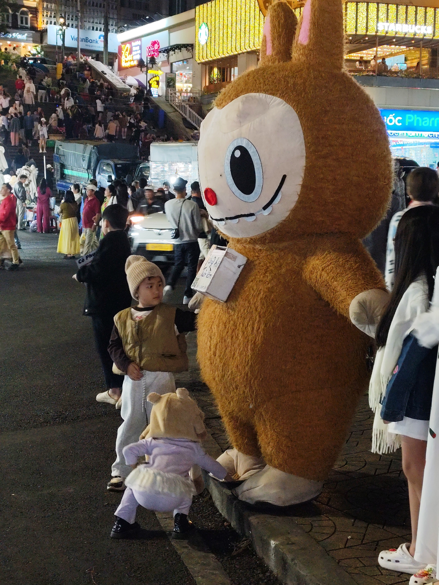 The image depicts a street scene in Da Lat, Vietnam, at night. A large, brown, cartoonish mascot resembling a rabbit stands on a sidewalk next to a curb. Beside the mascot, a young child in a beige kn…read more