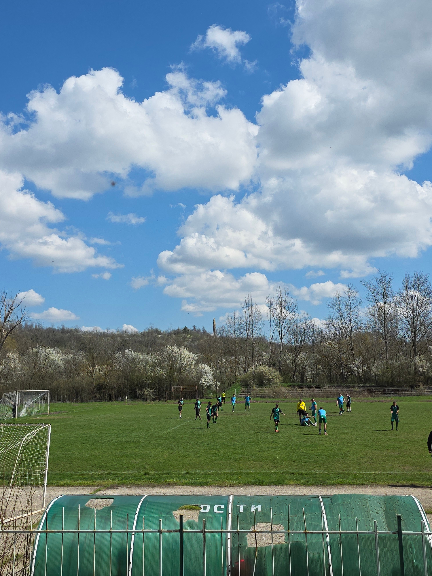 The image captures a football field in Byala Slatina, Bulgaria, under a sky filled with white, puffy clouds. A group of individuals, presumably football players, are scattered across the green grass,…read more