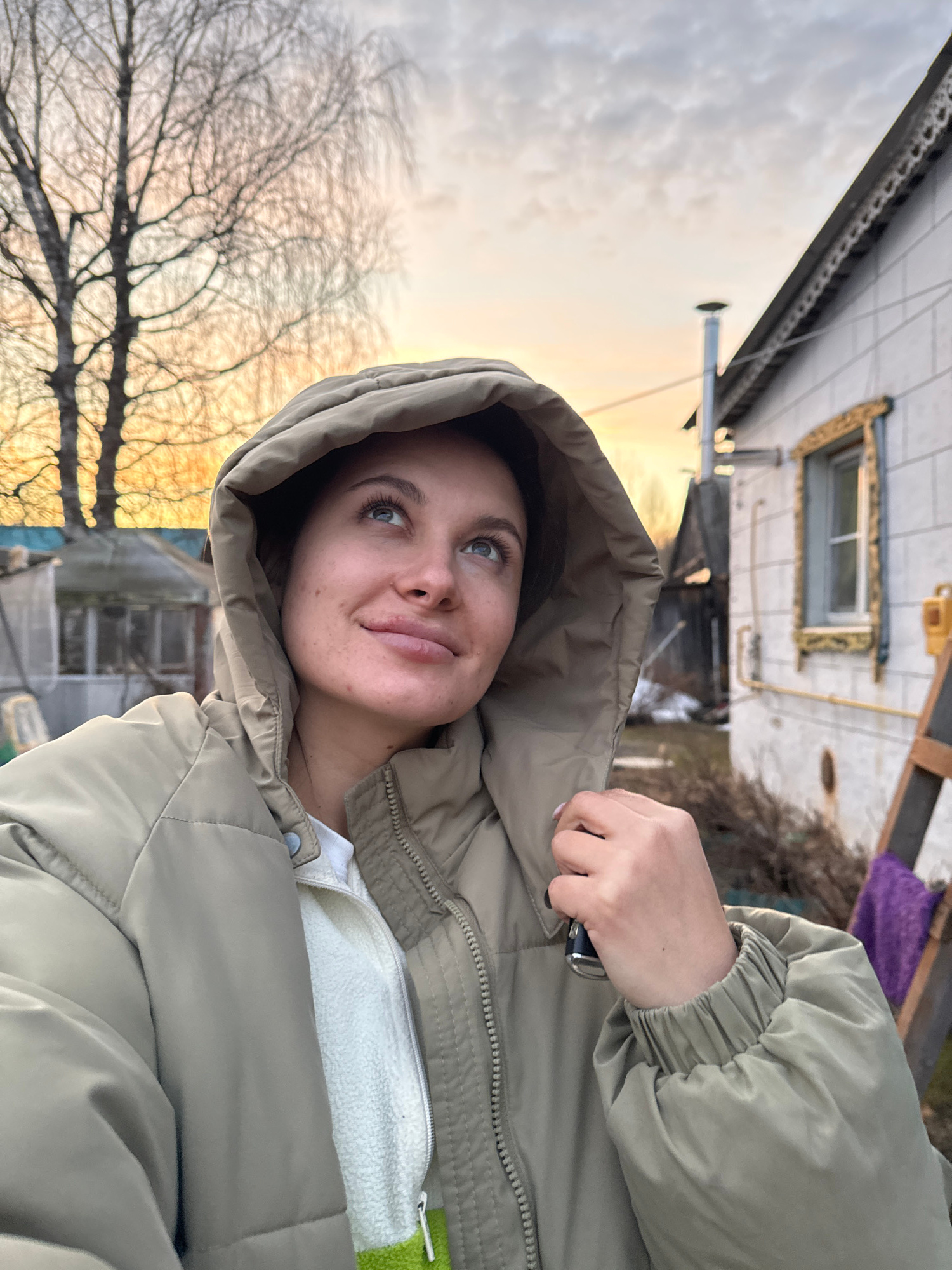 A medium shot depicts a woman in a hooded jacket, holding a key in her right hand. She is outside, with a house and bare trees in the background. The sky is partly cloudy with hints of sunset.