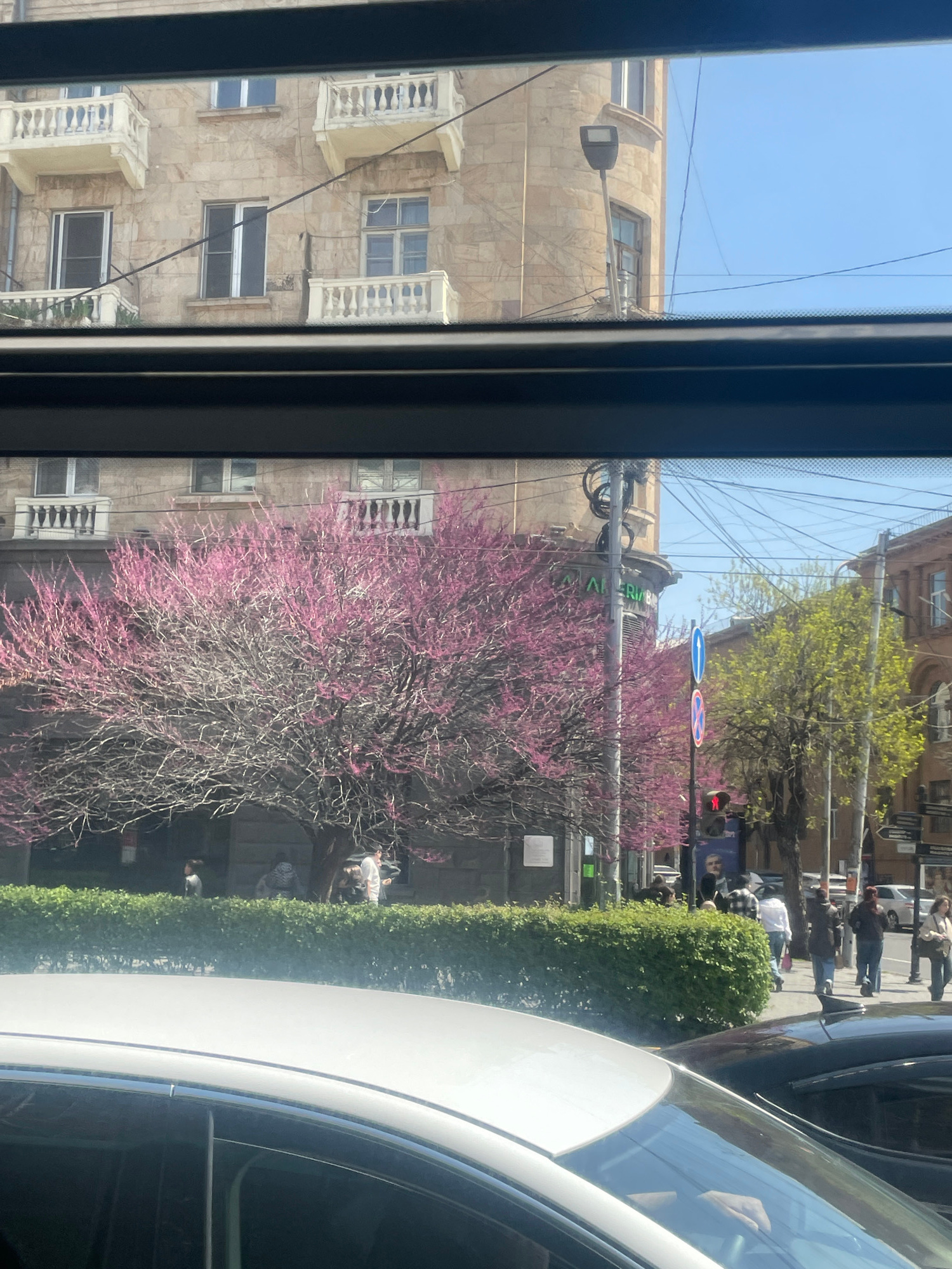 View from inside a vehicle in Yerevan, Armenia. A stone building with balconies is seen across the street. A tree with pink blossoms is in bloom along the sidewalk. Pedestrians walk on the sidewalk. A…read more