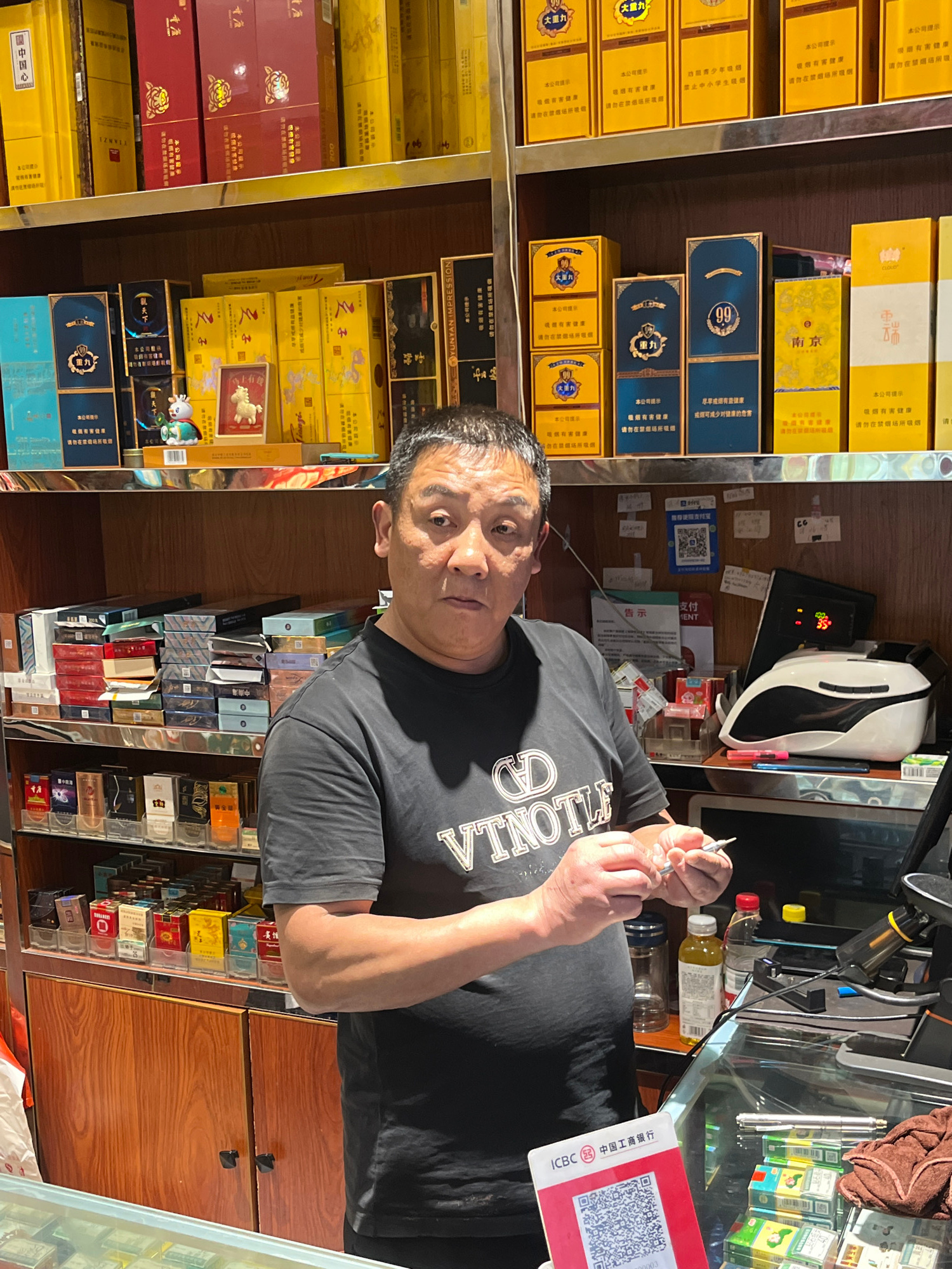 A person is holding a needle/syringe device, standing in front of shelves stocked with cigarettes. The shelves showcase multiple brands, including "Yunyan Impression", "Lion", "Tianzi", and "Chongyang…read more