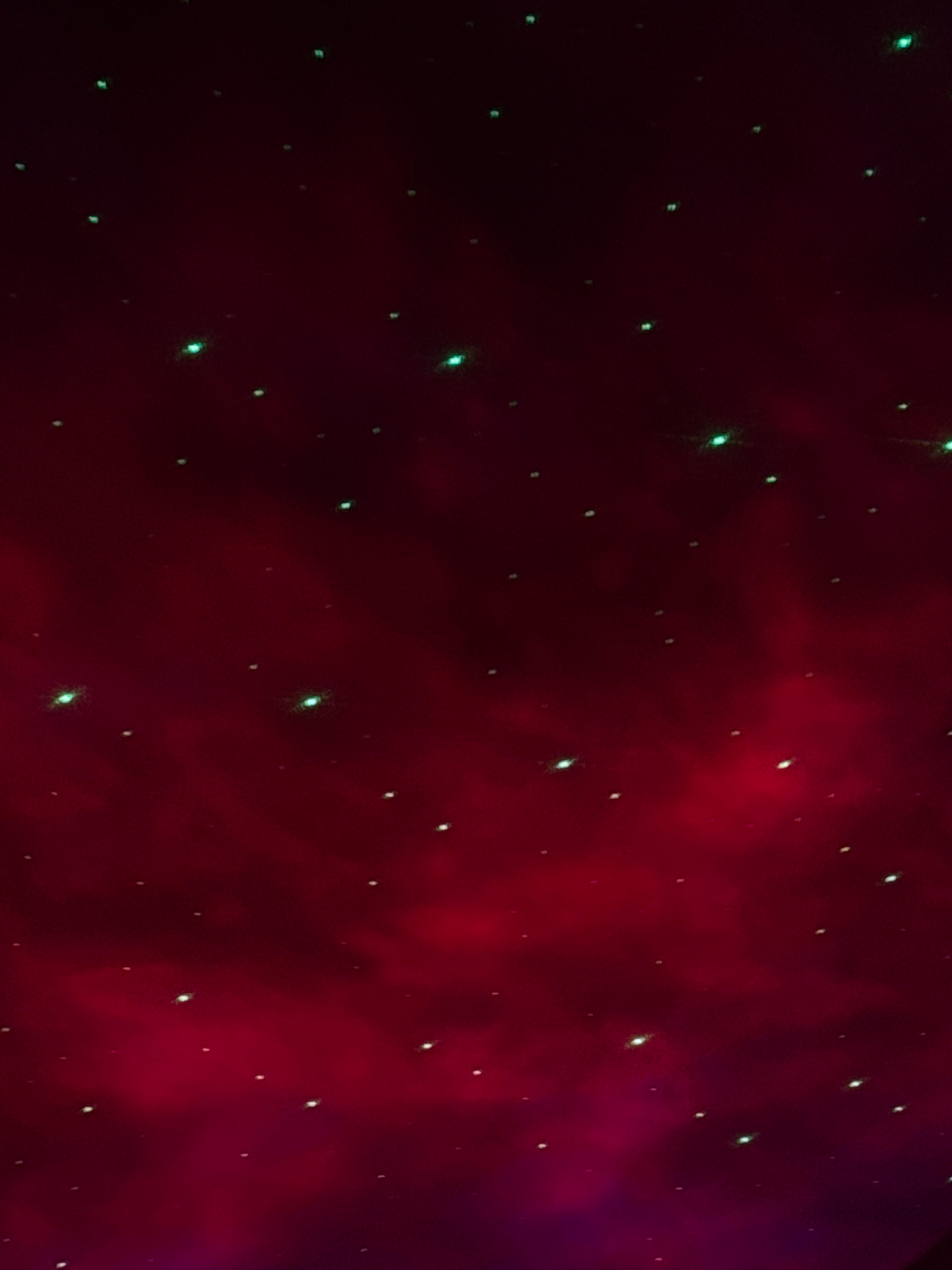 The image shows a dark, reddish-purple background with numerous small, green dots scattered across it. The background has a cloudy or nebula-like appearance, with variations in color and density. The…read more