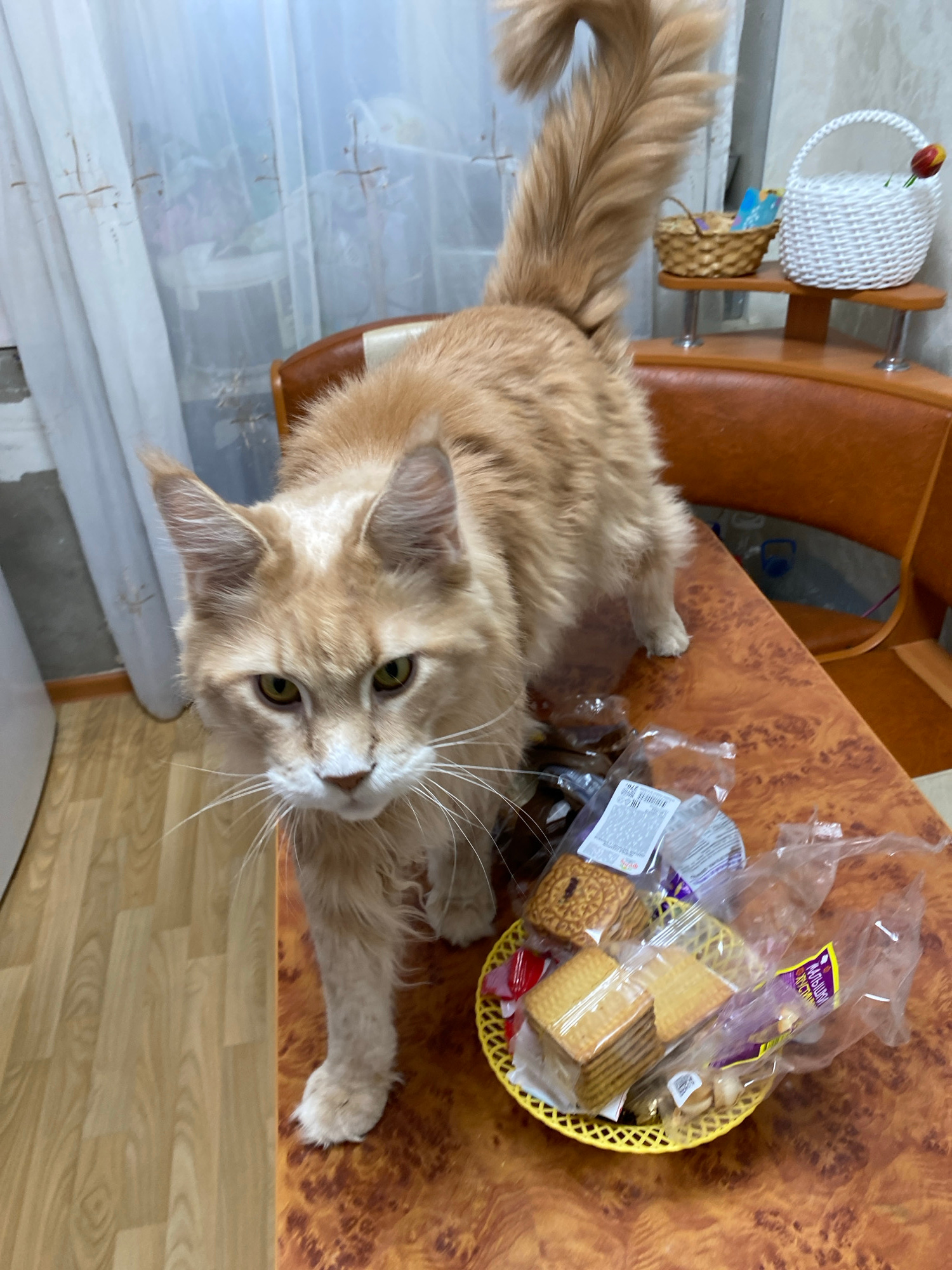 An overhead shot captures a fluffy, light orange and cream-colored cat, possibly a Maine Coon, lying on a wooden table. The cat's head is turned towards the camera, displaying prominent white whiskers…read more