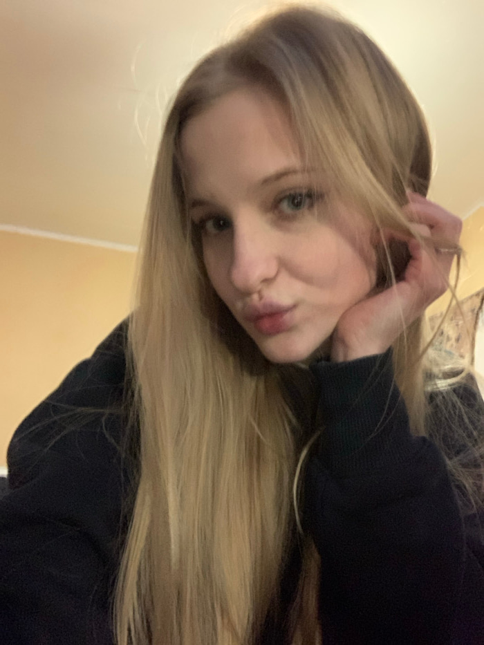 A blonde woman tilts her head, puckering her lips towards the camera. Her hand is up, fingers playing with her hair. She wears a dark-colored long-sleeved shirt. The background consists of a light-col…read more