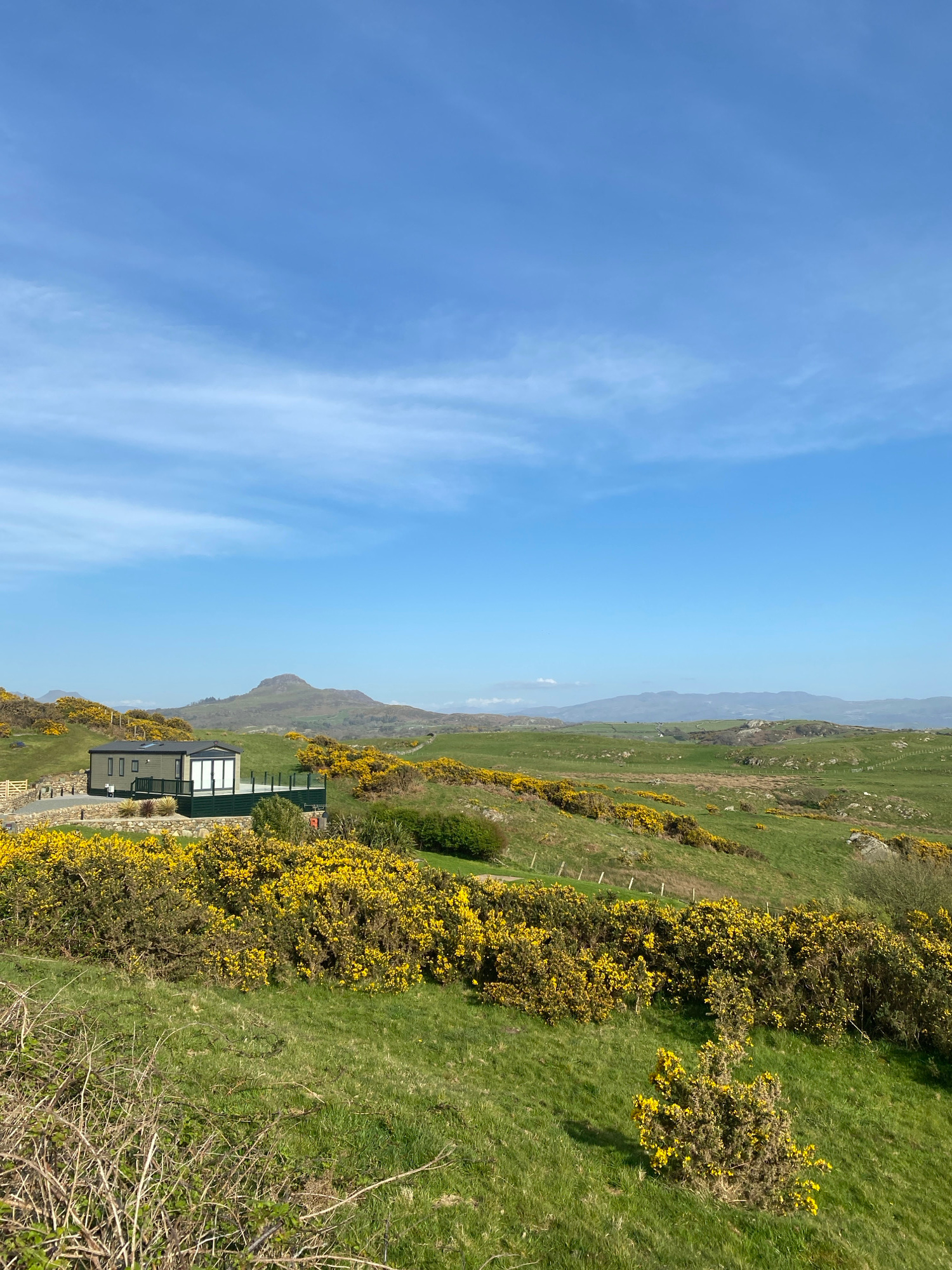 The image shows a coastal scene in Criccieth, United Kingdom. The sky is a bright blue with whispy clouds. The landscape features green hillsides dotted with bright yellow gorse bushes. A modern cabin…read more