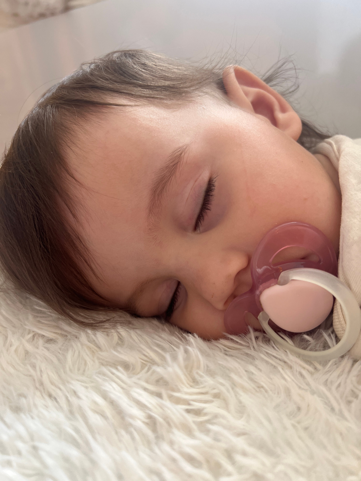 A close-up, upside-down image shows a baby asleep, with a pink pacifier in its mouth. The baby's face is fair, and its eyes are closed with visible eyelashes. Dark brown hair is visible around the for…read more