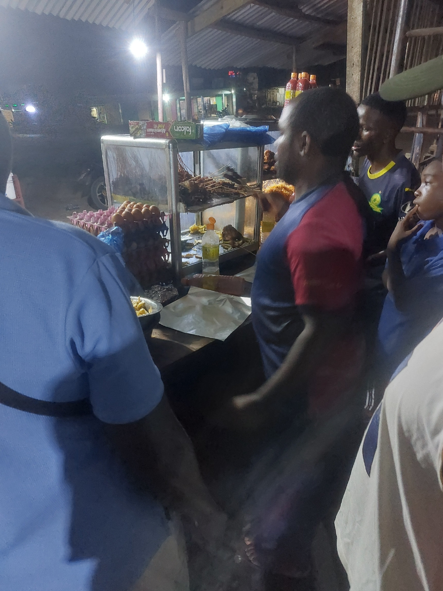The image shows a food stall in Dar es-Salaam, Tanzania. Three men are visible around the stall. One man is in a red and blue shirt, another wears a blue shirt, and a third wears a blue and yellow shi…read more