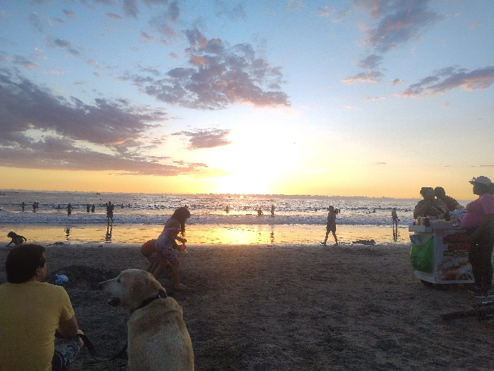 Sunset at a beach with people wading in the water. In the foreground, a man in a yellow shirt sits next to a Labrador dog. A woman and child are playing with sand. A food cart with several people nearβ¦read more