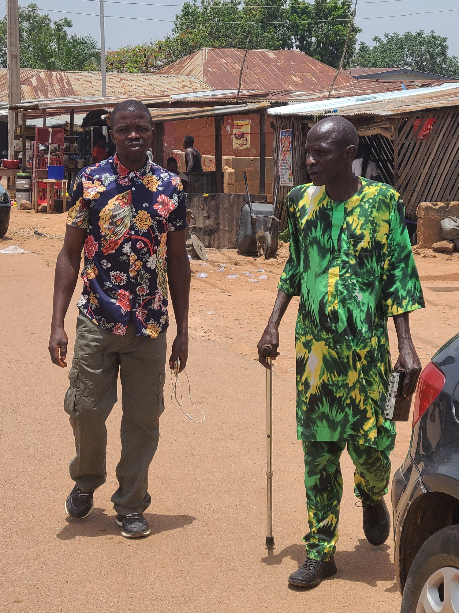 Two men are standing on a dirt street in Jos, Nigeria. The man in the foreground is wearing a blue floral shirt and olive green pants. He is holding white earbuds. Behind him, an older man is wearing…read more