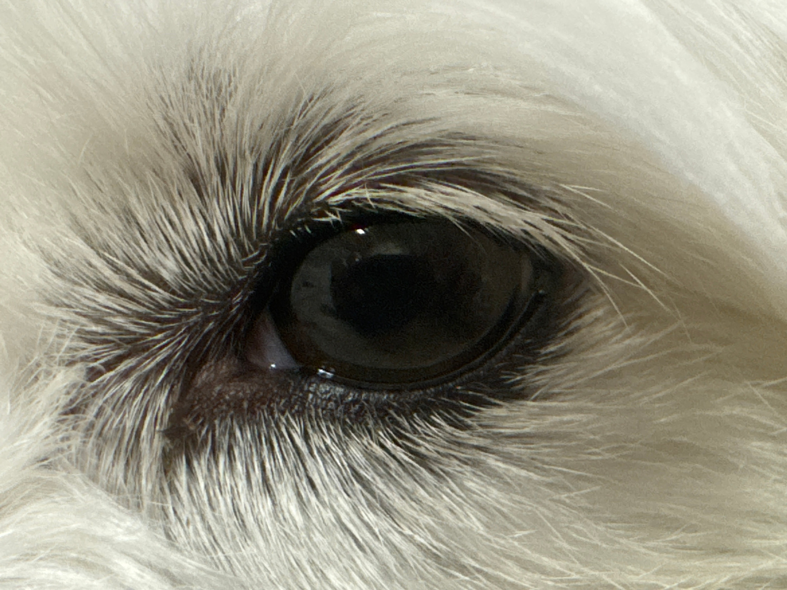 A close-up shot focuses on the left eye of an animal, likely a dog, surrounded by white fur. The eye is dark brown, with a visible light reflection within the pupil. The fur around the eye is dense an…read more