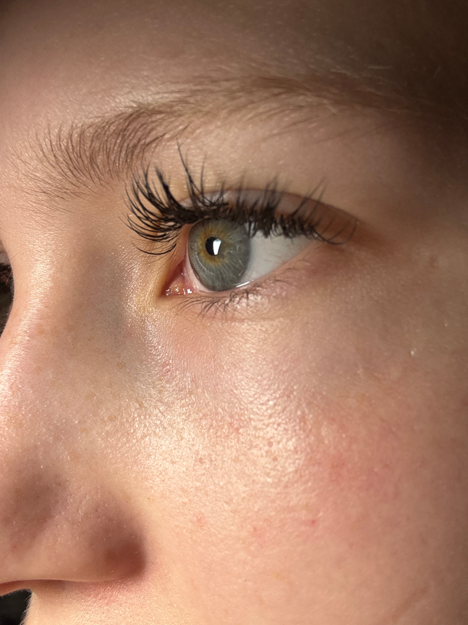 The image shows a close-up of a human eye and surrounding facial skin. The eye is light gray-green with dark eyelashes. The skin exhibits pores and minor imperfections, suggesting a youthful complexio…read more