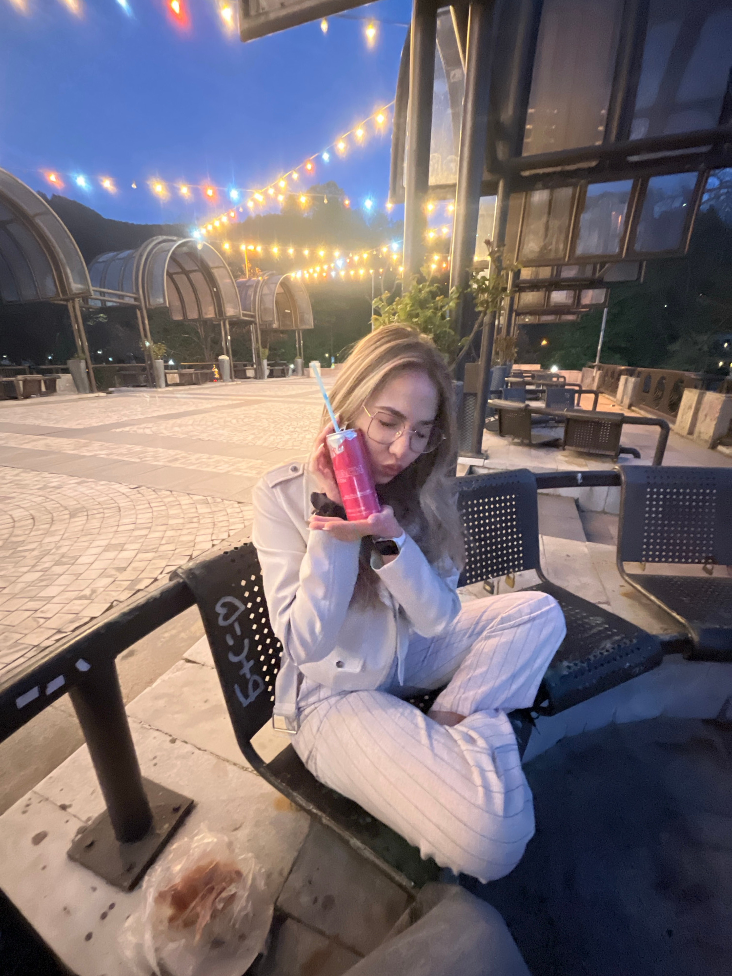 A woman sits on a metal bench outdoors, holding a red can with a straw in her hands. She is wearing glasses, a light-colored blazer, and striped pants. She appears to be relaxing, leaning back slightl…read more