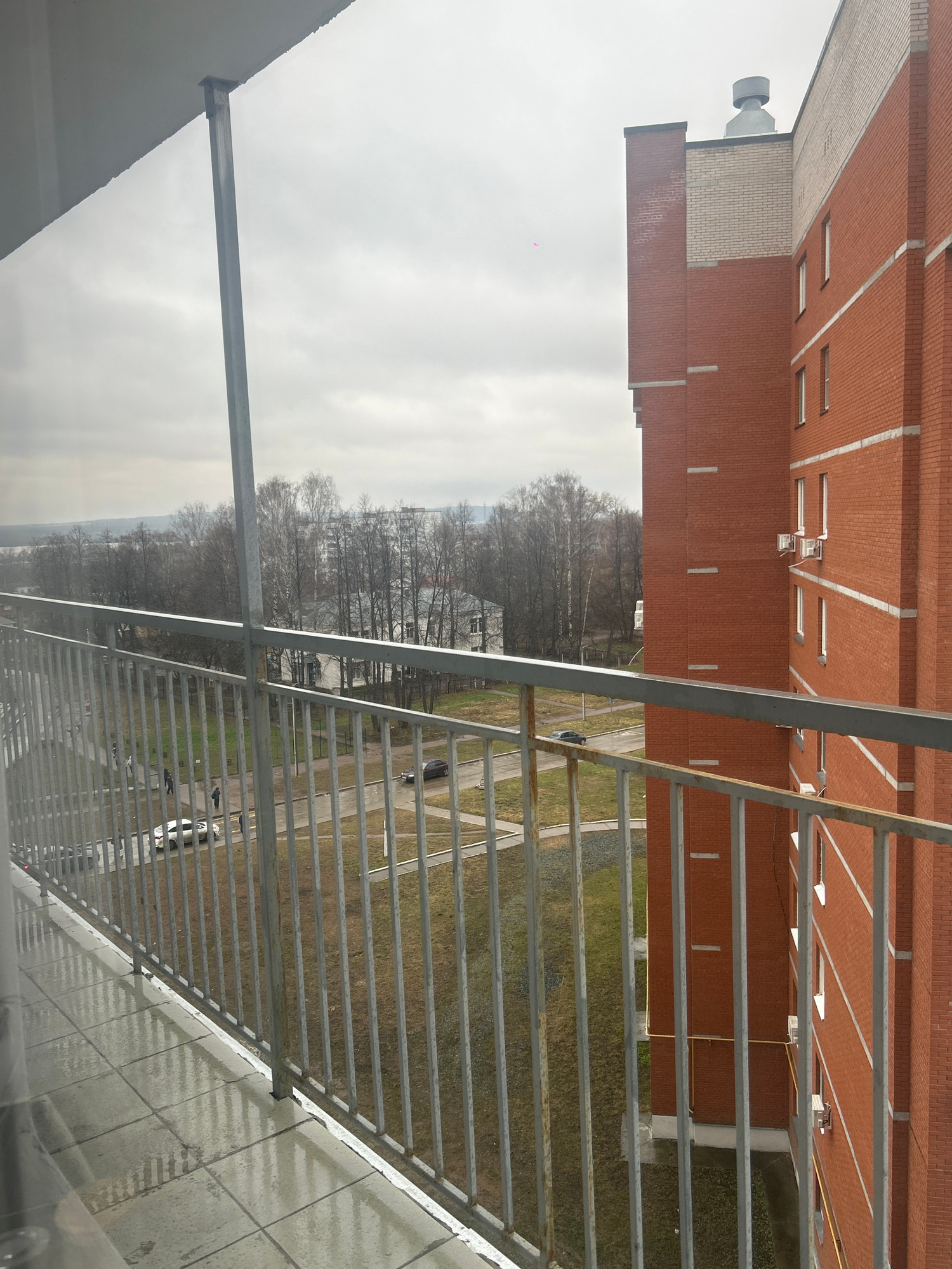 The image shows a view from a high vantage point, possibly a balcony, in Chaikovsky, Russia. A multi-story brick building with white trim is visible adjacent to the vantage point. The balcony has a me…read more