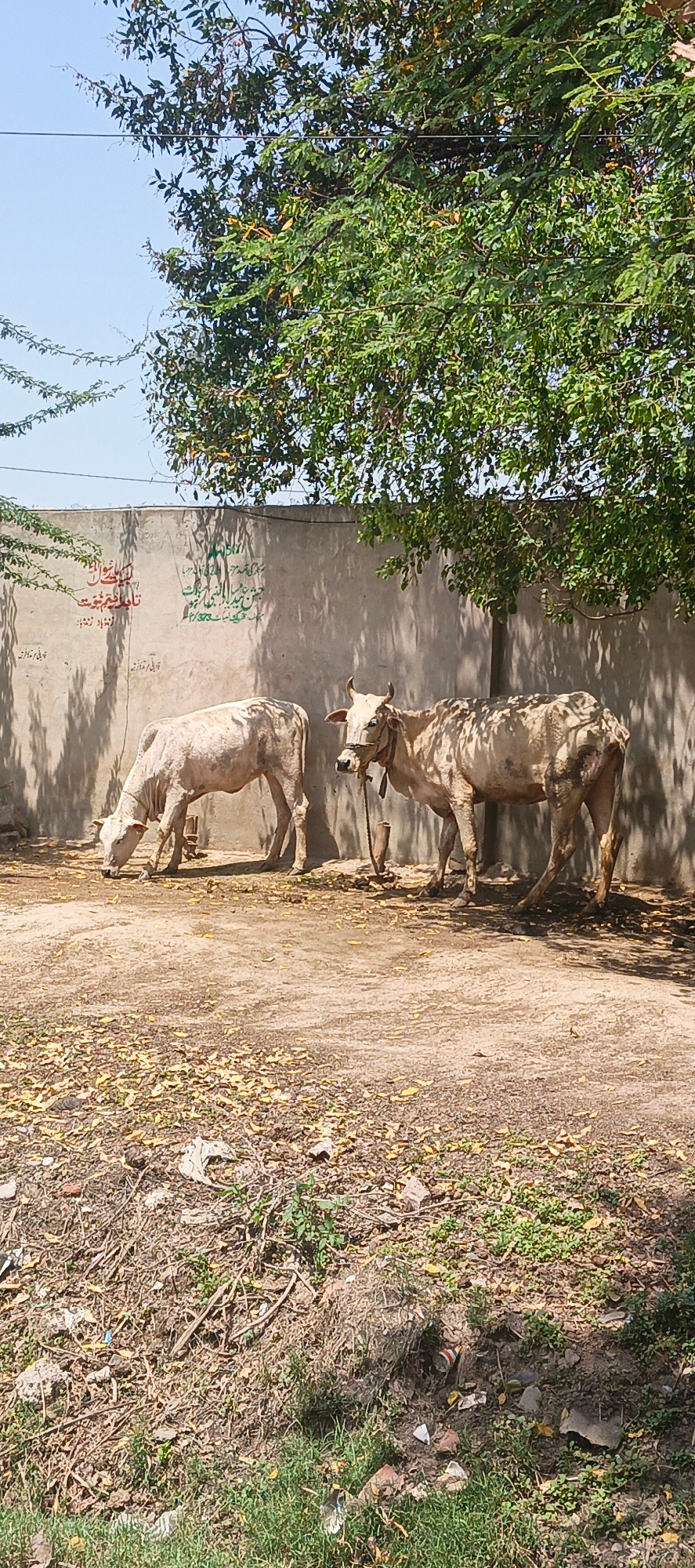 The image displays an outdoor scene, likely a rural or semi-urban area, featuring two light-colored cows in front of a concrete wall under the shade of a large tree. The setting appears to be a bright…read more
