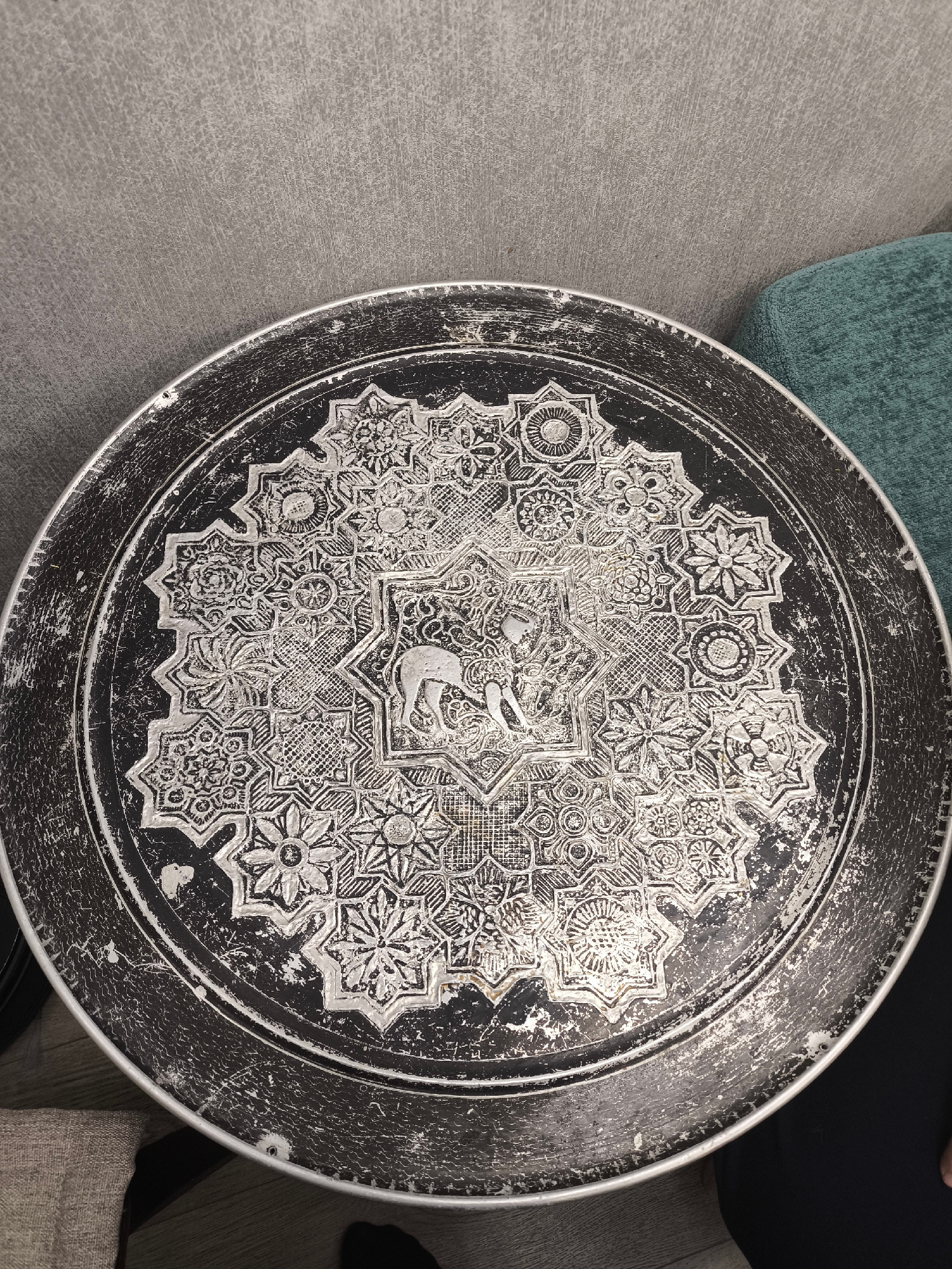 The image shows a round, possibly metal, tray or table top with intricate geometric and floral designs etched into its surface. A stylized image of a camel is centered within a star-shaped section of…read more