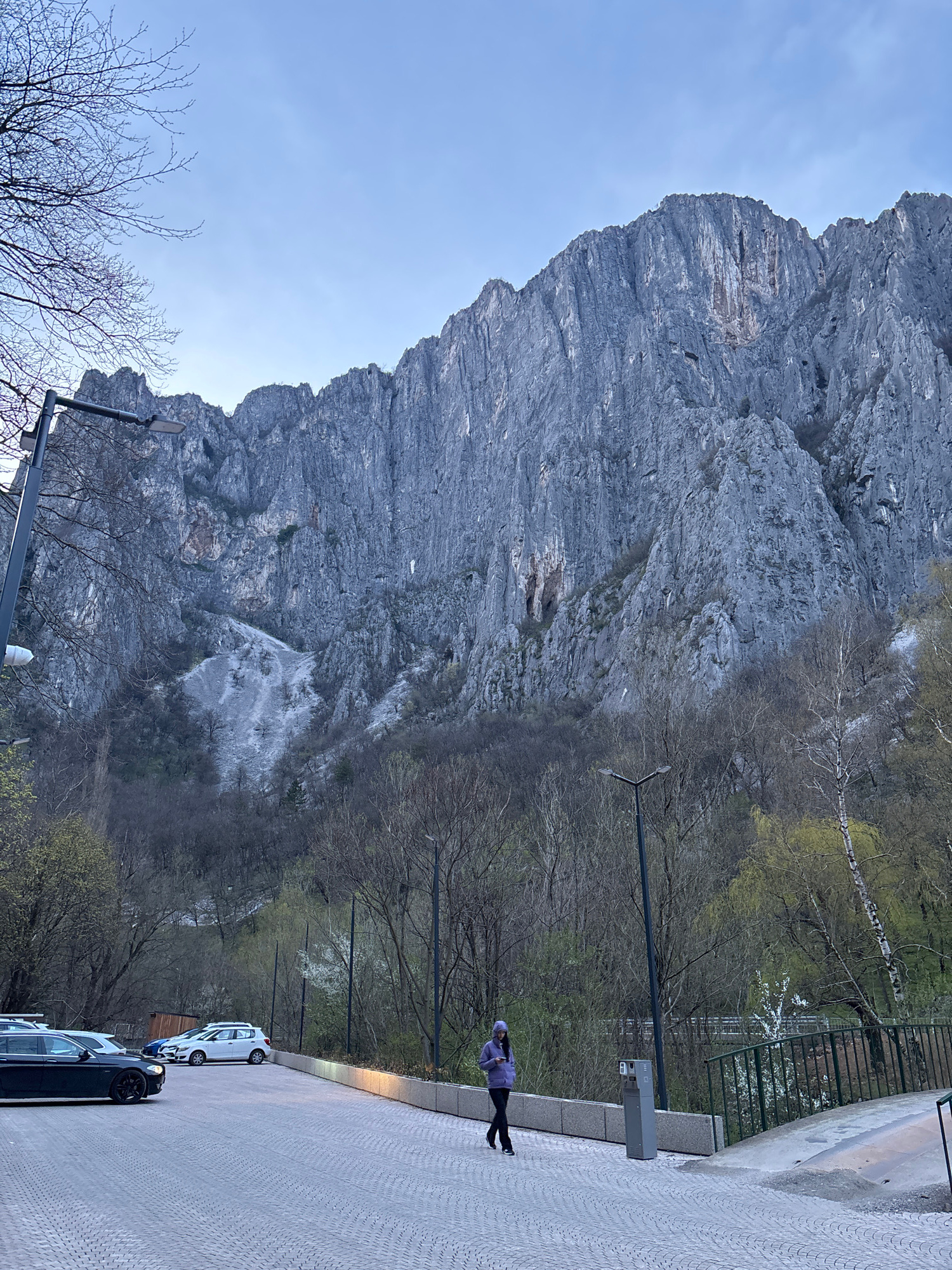 The image shows a massive rock formation in Vratsa, Bulgaria. A person in a purple jacket stands on a paved area, appearing to look at the rock face. Several cars are parked parallel to the pavement.…read more