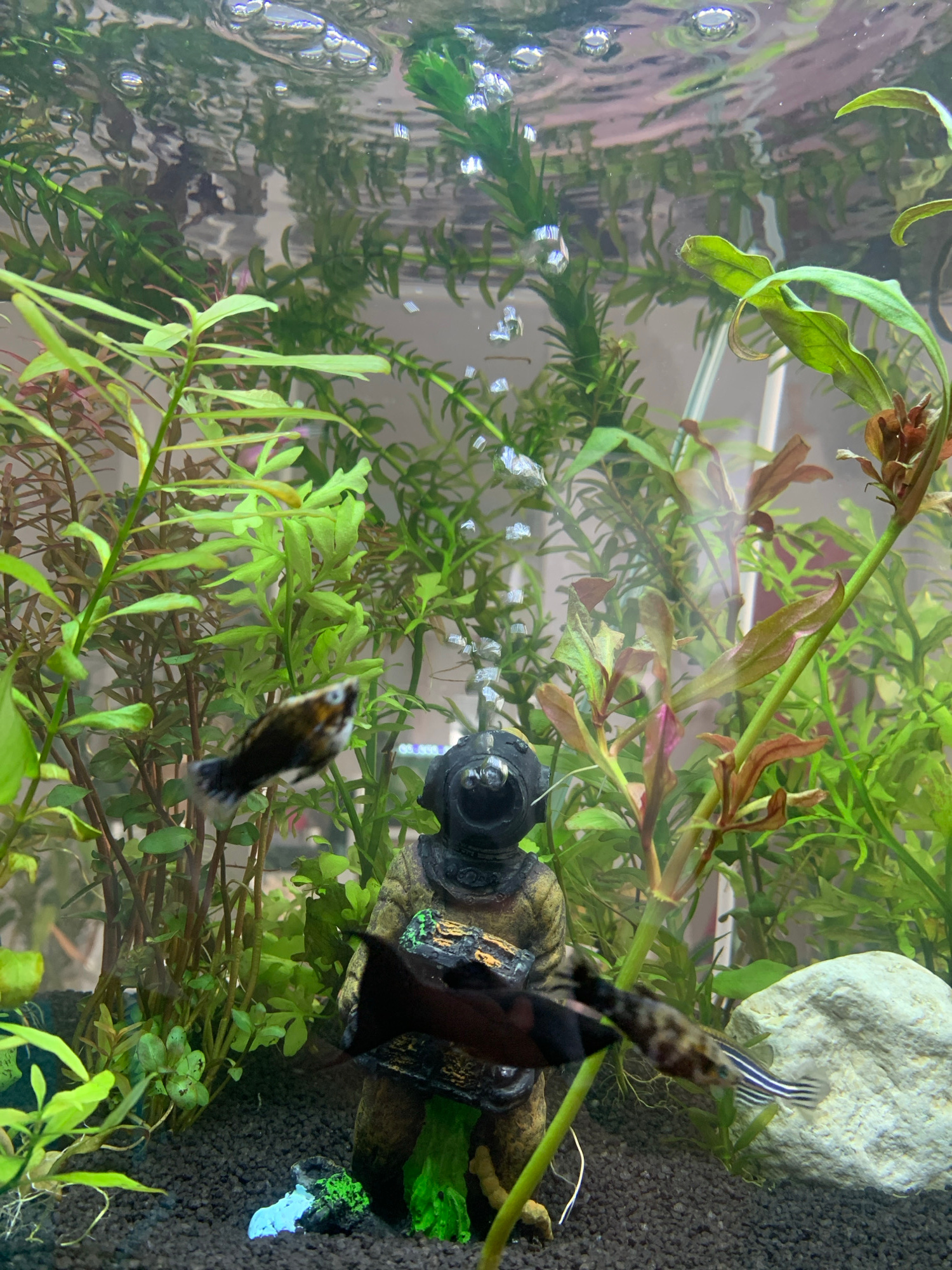 An indoor aquarium is depicted, filled with various aquatic plants, fish, and decorative elements. The scene is dominated by lush green foliage, with some plants exhibiting reddish-brown accents, sugg…read more