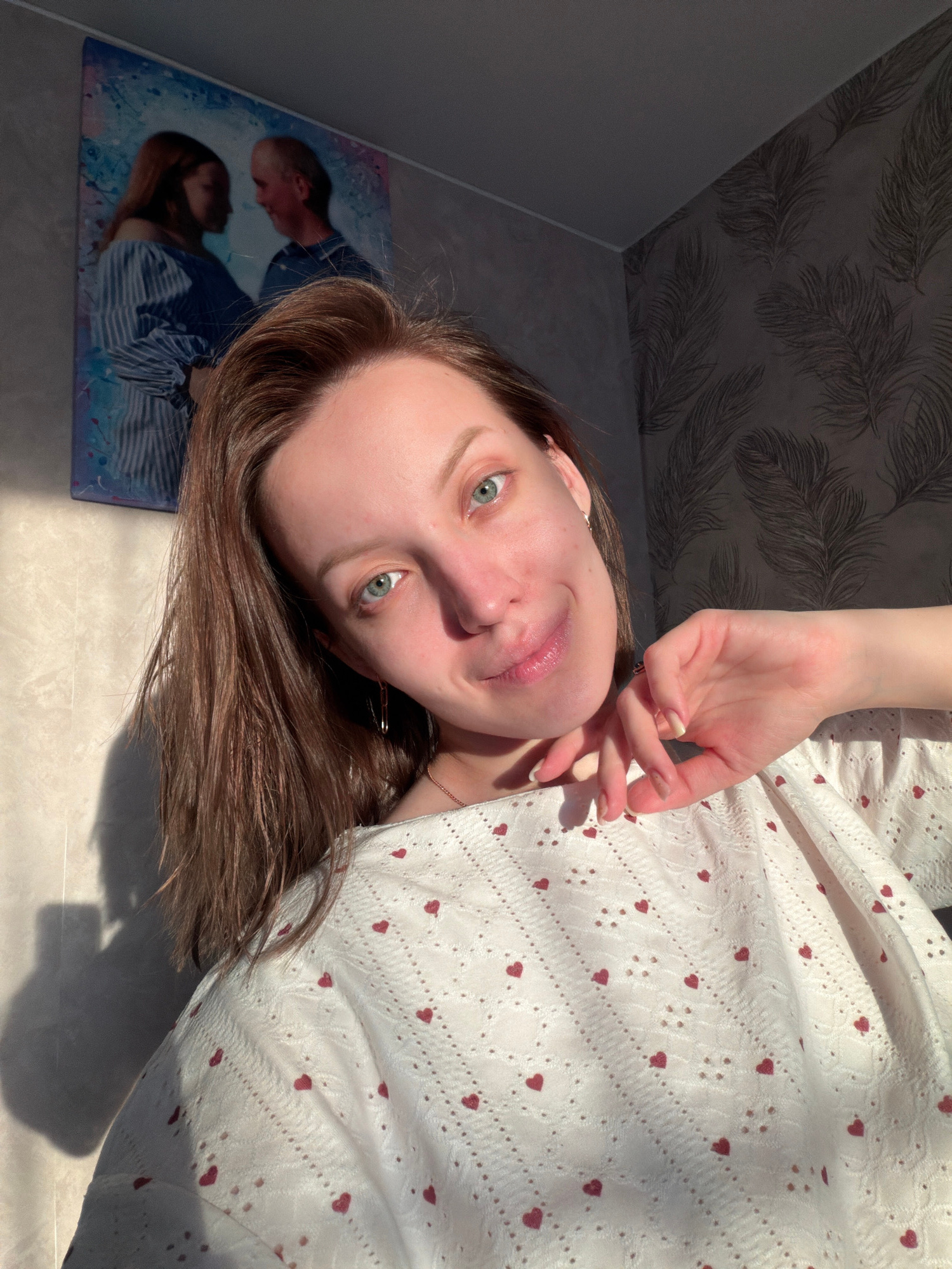 The image, captured in Reshetnikovo, Russia, presents a young woman from an overhead perspective, likely taking a selfie while lying down. She has light brown hair and captivating blue-green eyes, loo…read more