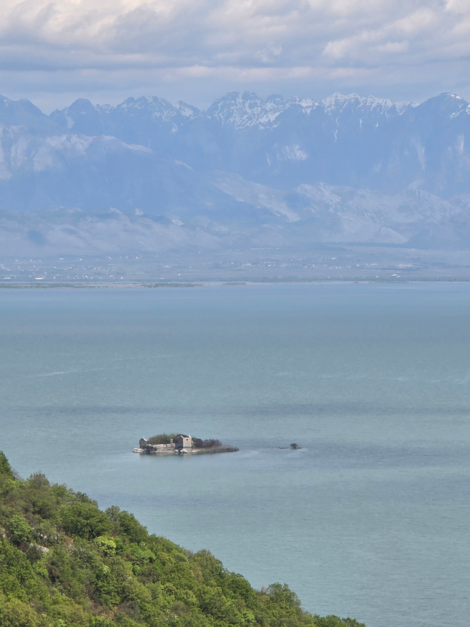 The image shows the Skadar Lake, with the island of Grmožur, near the village of Godinje, Montenegro. The island features a partially ruined stone building, surrounded by low vegetation and bare rock,…read more