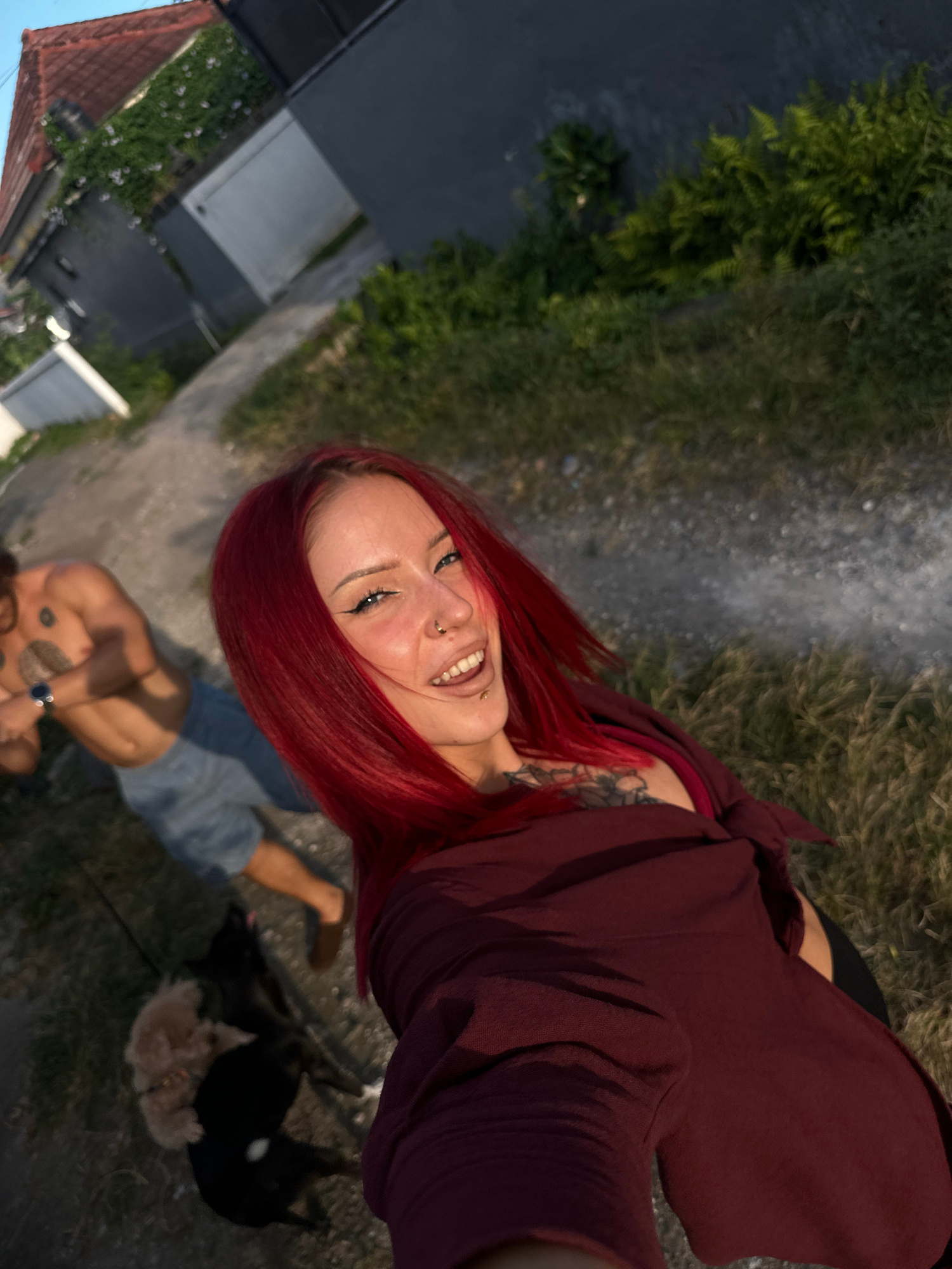 The image captures a selfie-style view with a young woman, positioned towards the top, smiling at the camera. She has red hair and facial piercings, and is wearing a maroon top. Visible tattoos are pr…read more