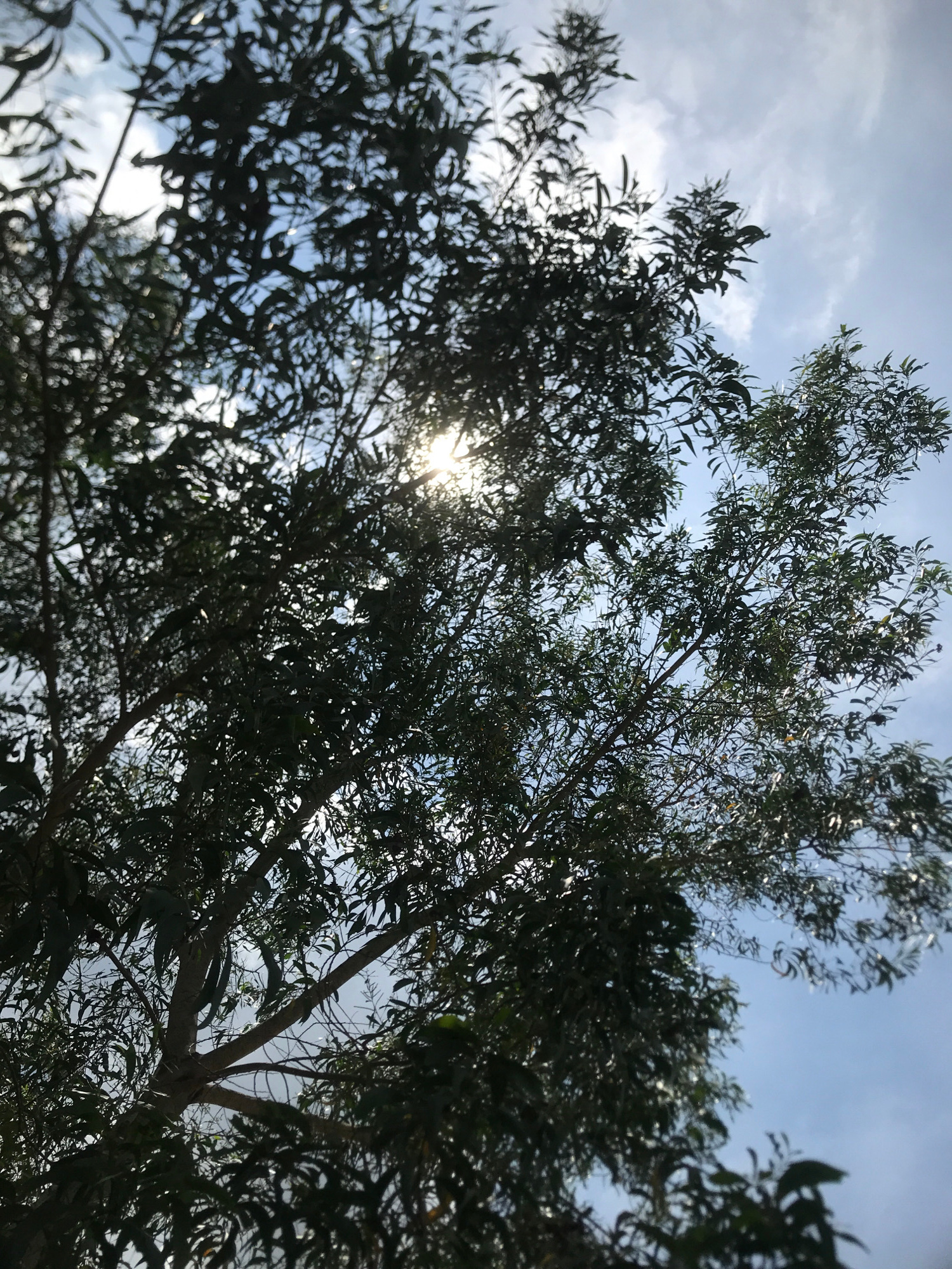 The image depicts a low-angle view looking up through the dense foliage of trees. The leaves are small and narrow, characteristic of eucalyptus or willow trees. Sunlight filters through the branches,…read more