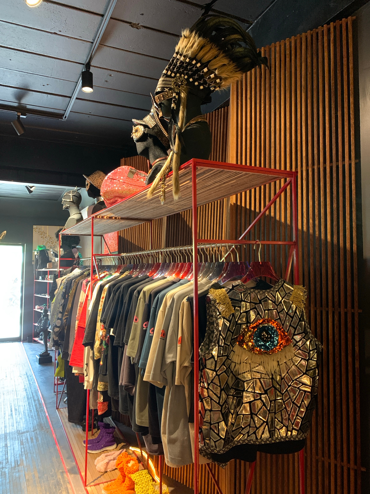 The image shows the interior of a clothing store in Ko Samui, Thailand. A red metal clothing rack stands prominently, filled with garments on hangers. The rack contains a variety of clothing items, in…read more