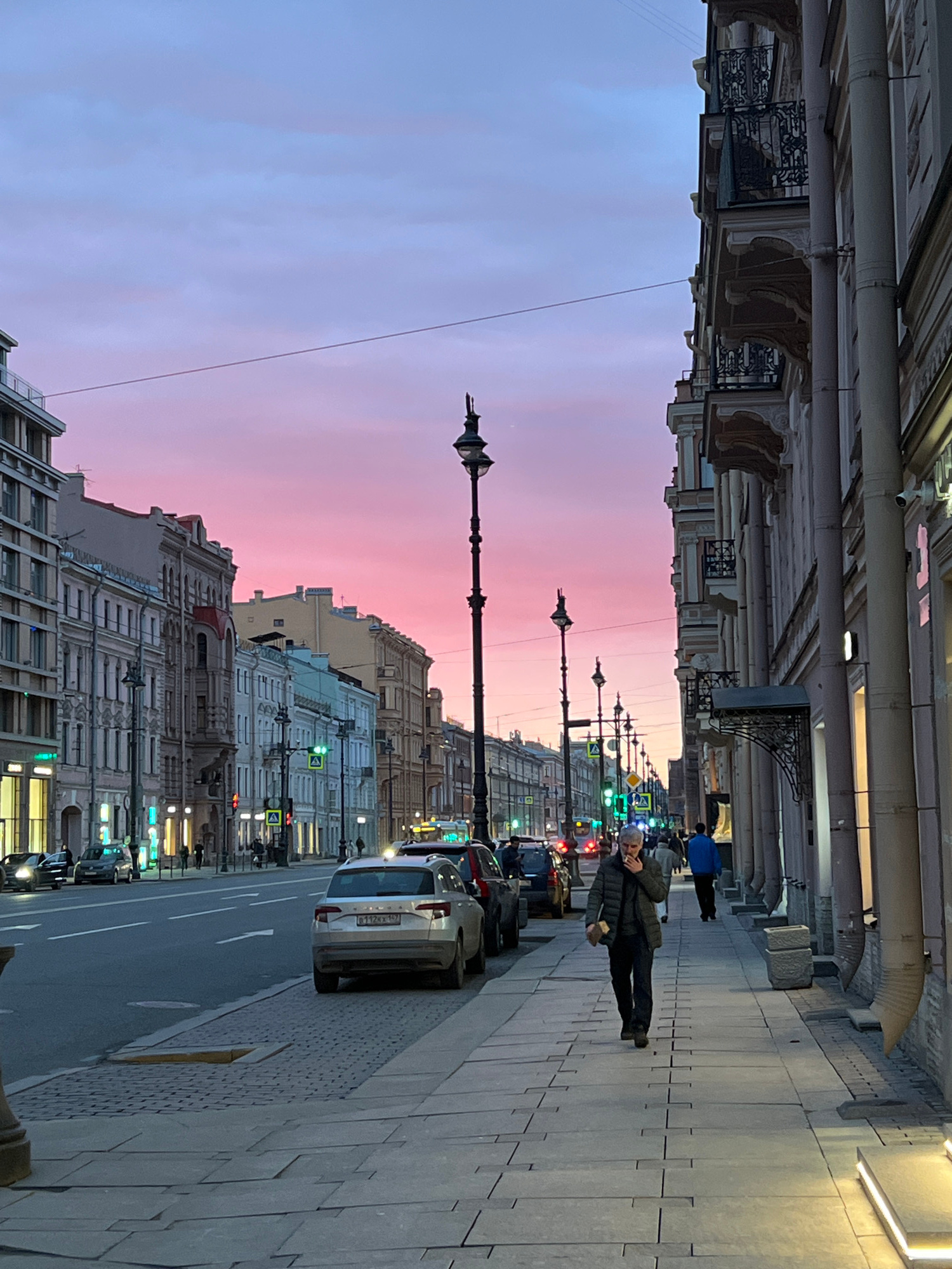 The image captures a street scene in Saint Petersburg, Russia, during twilight, characterized by a pink and violet sky. The perspective is from the sidewalk, looking down a wide avenue lined with clasβ¦read more