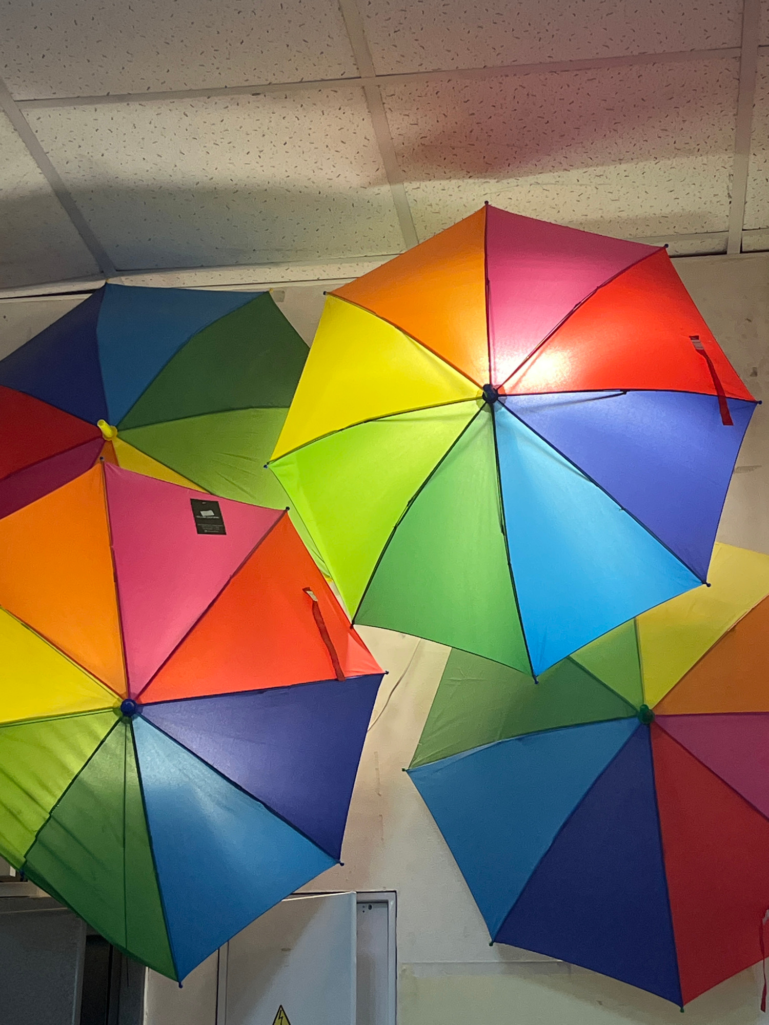 The image depicts three colorful, rainbow-colored umbrellas. The umbrellas are arranged in a cluster, overlapping each other, and appear to be indoors. The umbrellas have sections of red, orange, yell…read more