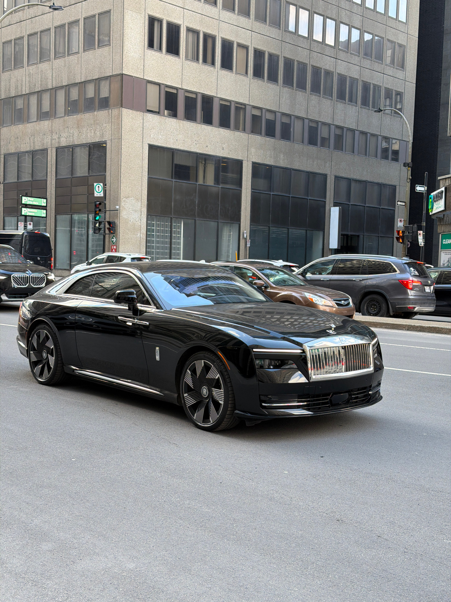 A black Rolls-Royce Cullinan is parked on a city street in Montreal, Canada, in front of a tall, modern building with numerous windows. Traffic lights are visible and a sign with a green arrow points…read more