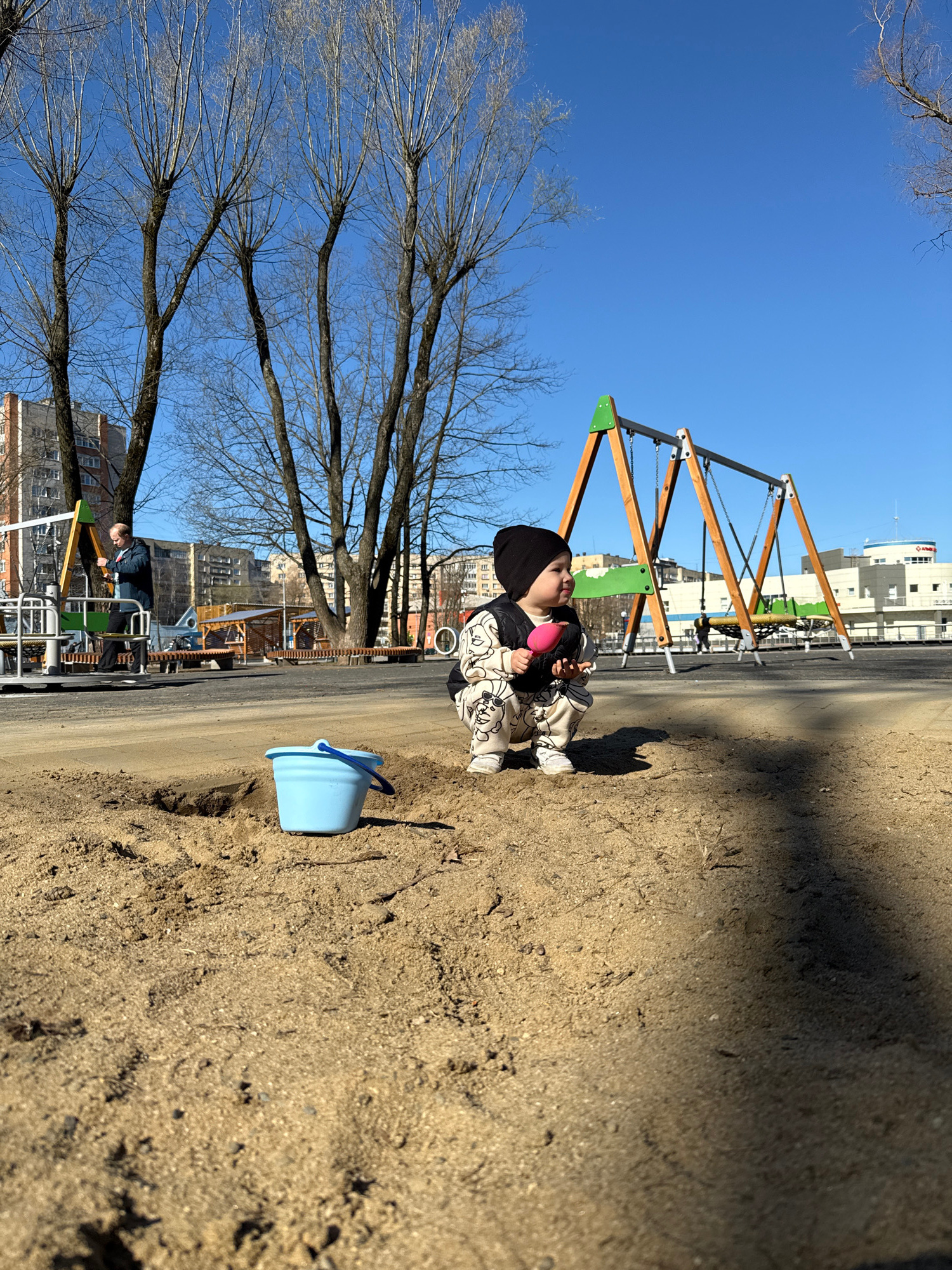 The image shows a young child sitting in a sandbox in what appears to be a playground or park. The child is wearing a black beanie, a patterned outfit (possibly a jumpsuit), and shoes, and is holdingβ¦read more
