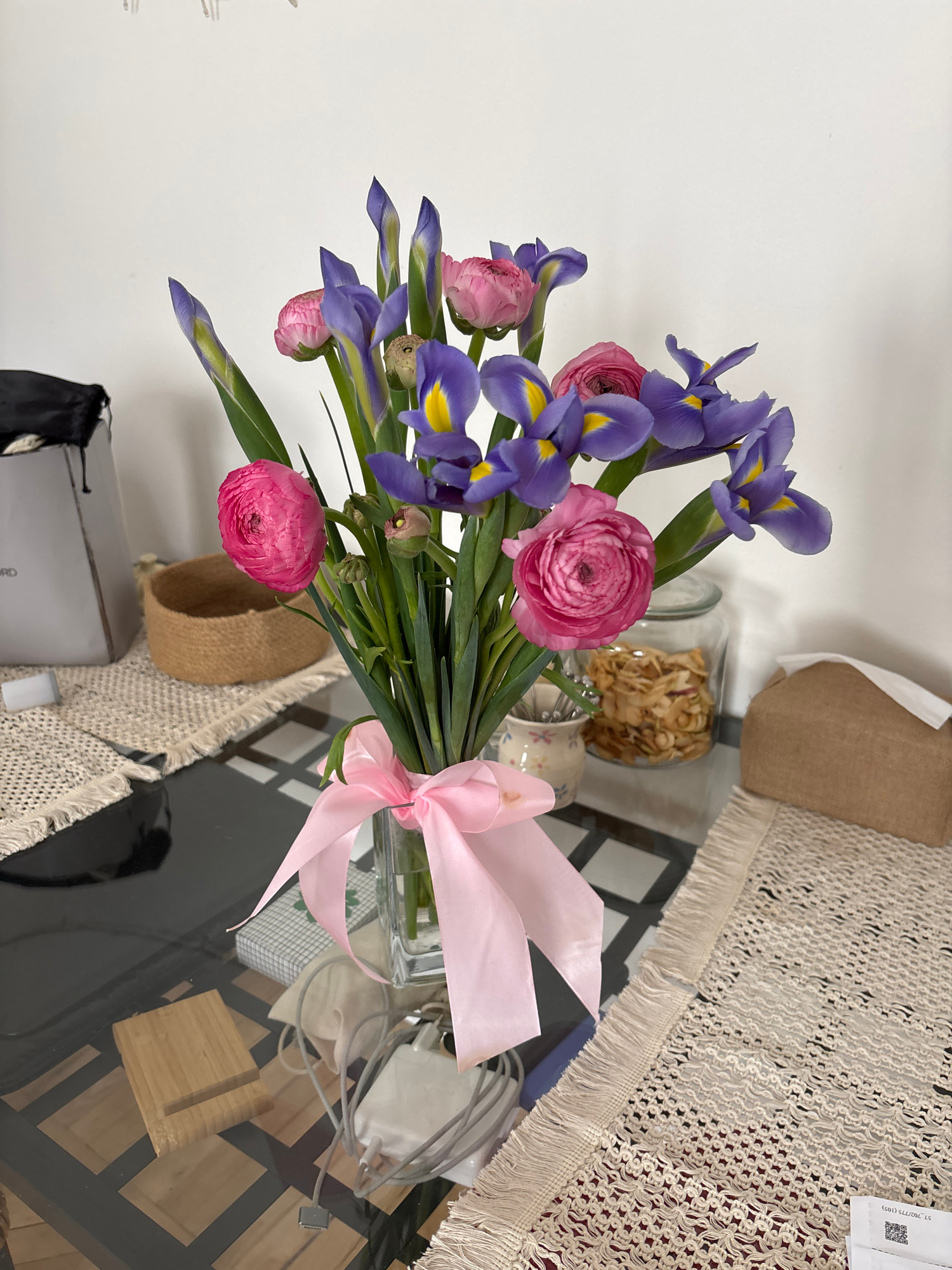 A bouquet of blue and purple irises and pink ranunculus flowers, tied with a light pink ribbon, sits on a glass-topped table with a patterned surface. The table is covered with a light-colored, fringeβ¦read more