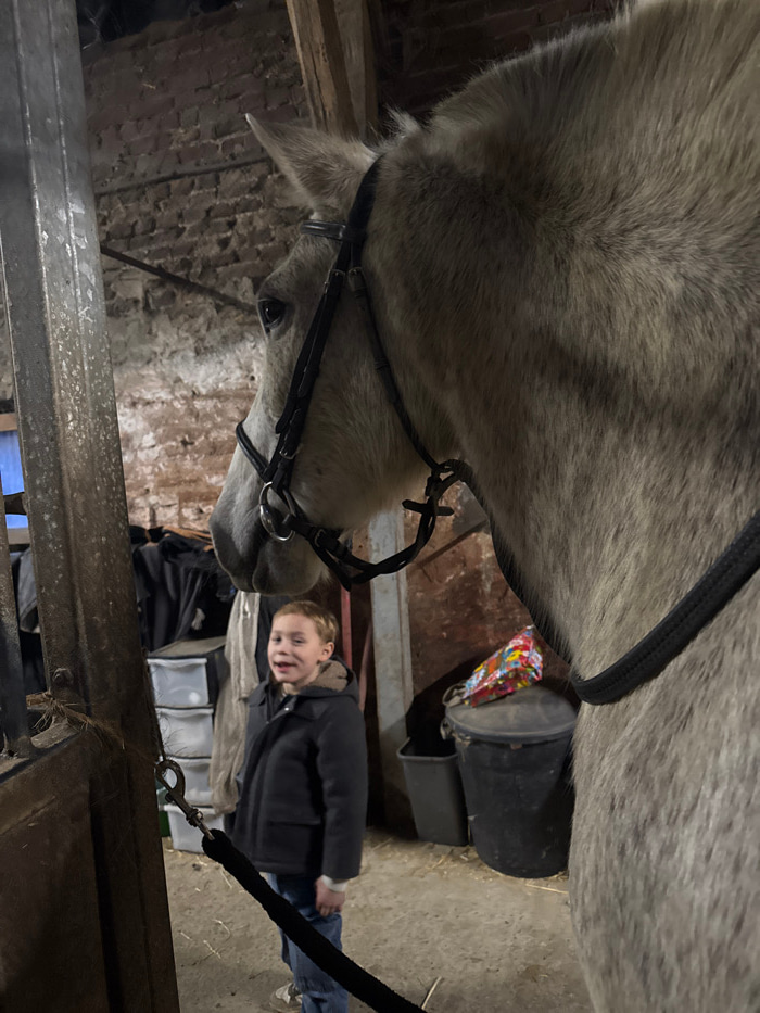 A light gray horse with a black bridle stands in what appears to be a barn. A young person, wearing a dark jacket and jeans, stands to the right of the horse, holding its lead rope. Buckets, bags, and…read more