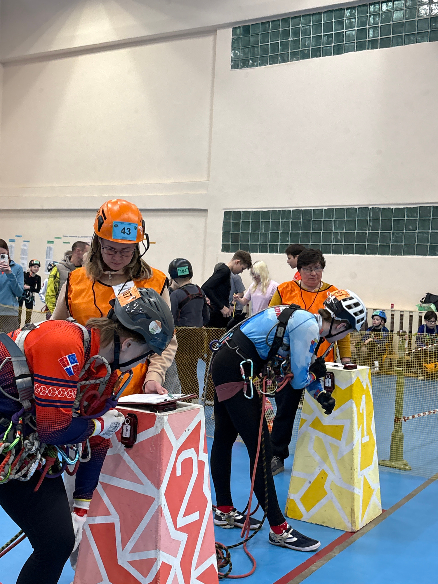 Several people, primarily young adults, are participating in a vertical rope access competition indoors. The setting appears to be a large gymnasium with a blue floor and white walls. Some of the indi…read more