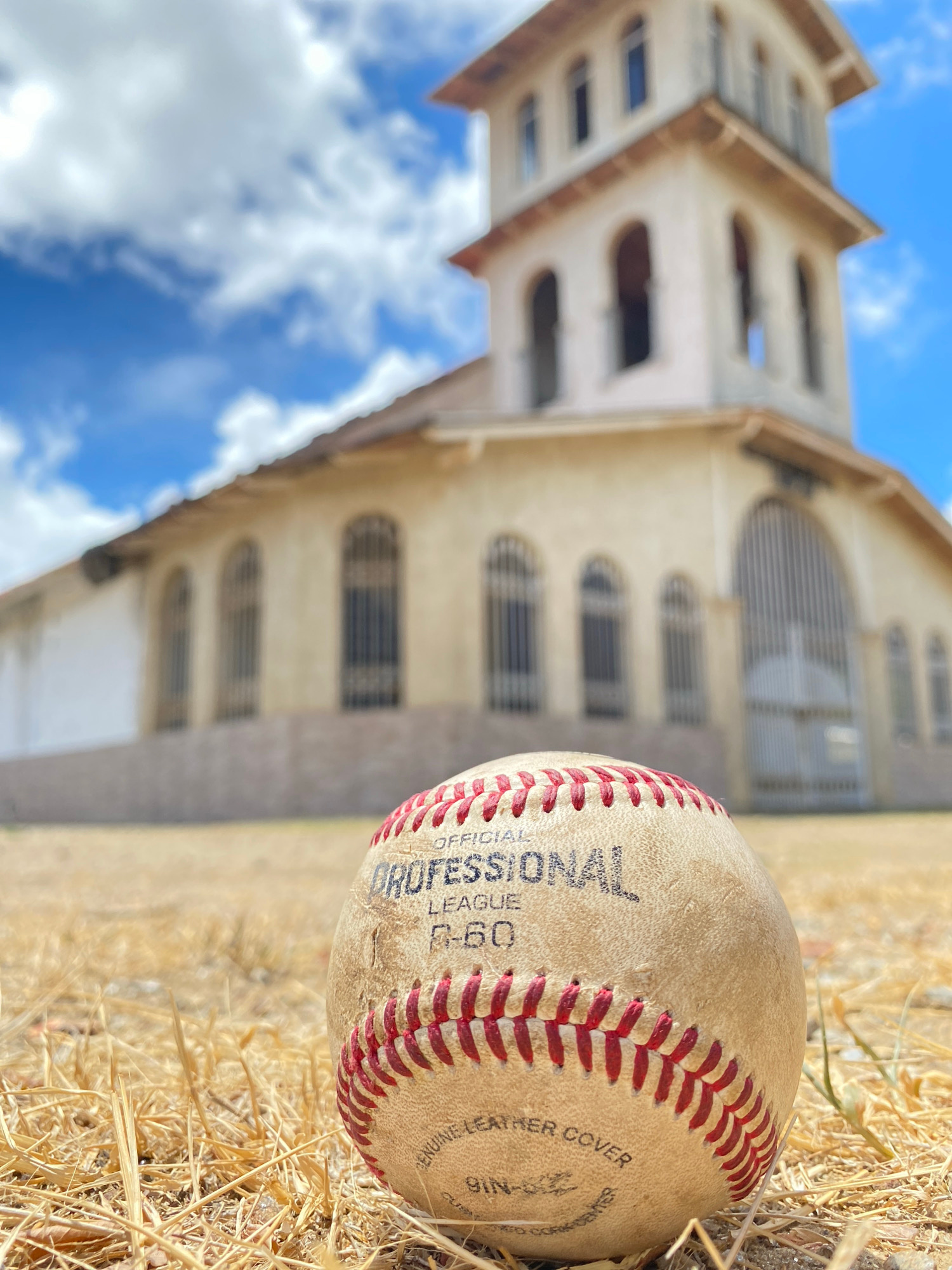 The image shows a baseball lying on dry grass in front of a blurred building under a partly cloudy sky. The baseball is labeled "Professional League" and has red stitching. The building is off-white w…read more