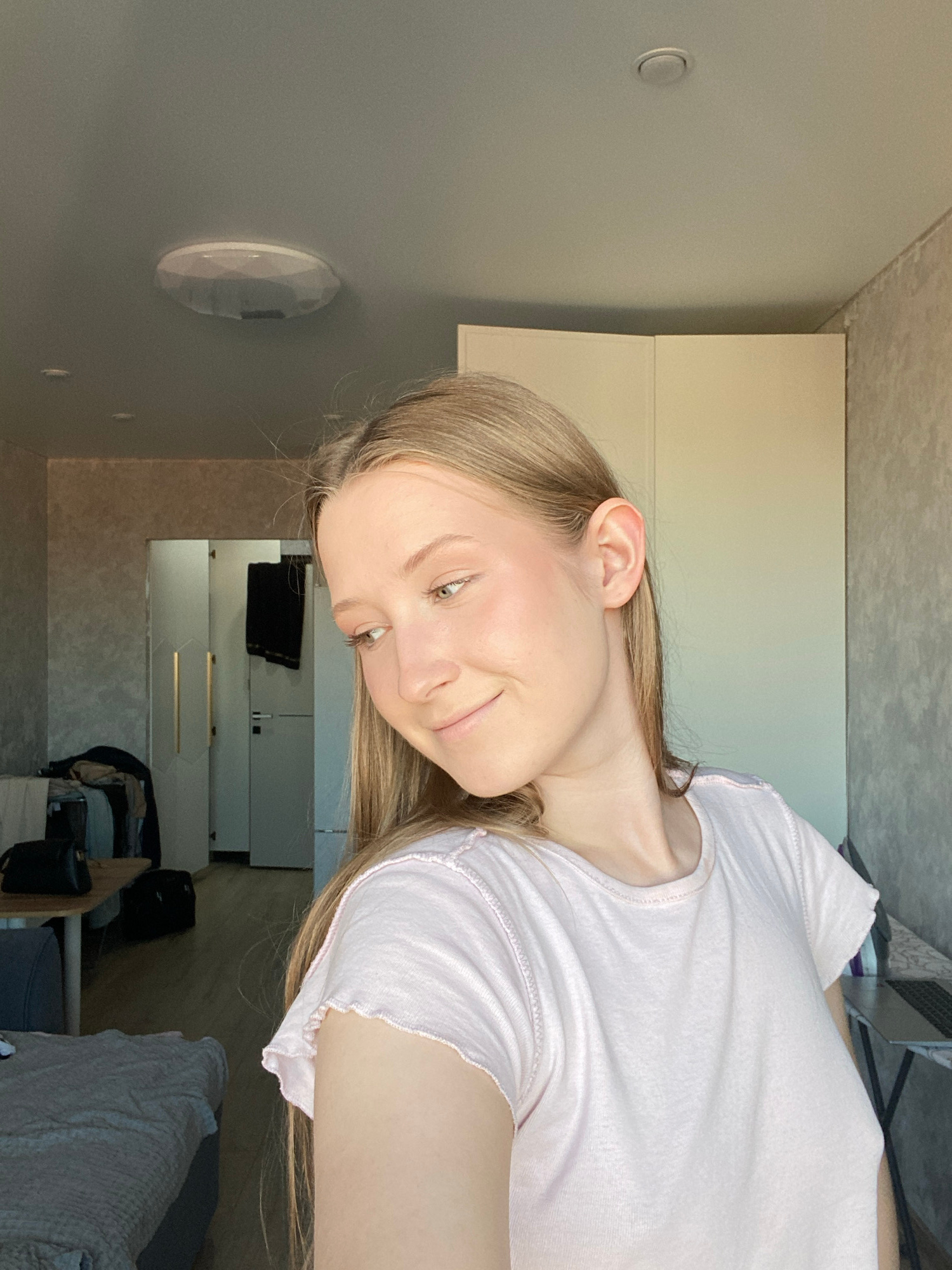 A young woman with long, straight light brown hair and light-colored eyes is captured in a close-up, horizontal portrait, smiling softly. She is wearing a light pink, short-sleeved t-shirt with a ruff…read more