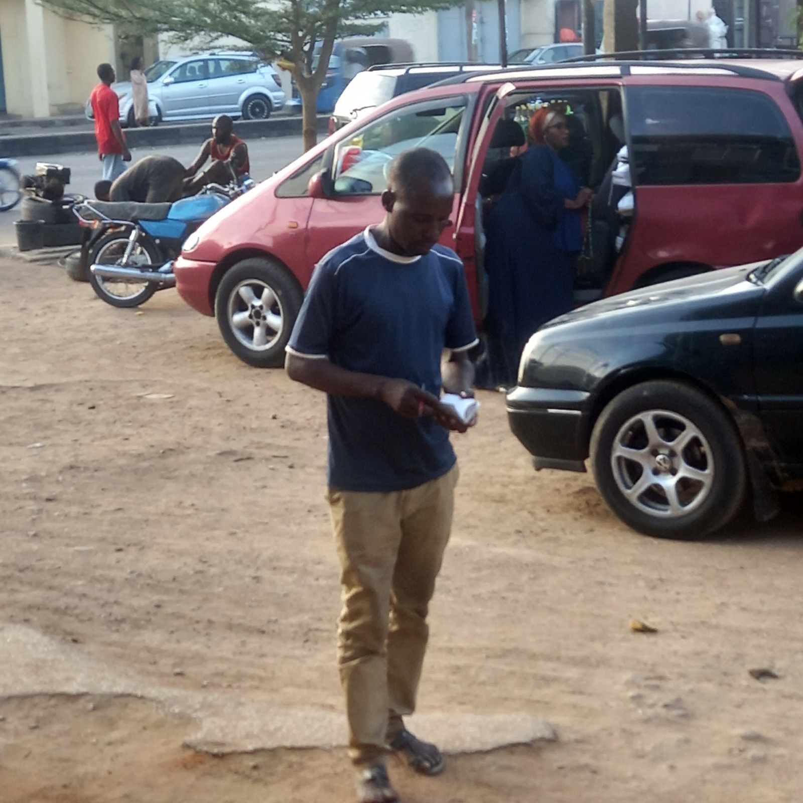 This outdoor street scene, set in Sardauna, Nigeria, captures several people and vehicles on what appears to be an unpaved, dusty road. The image is taken during daylight hours, indicated by the brigh…read more
