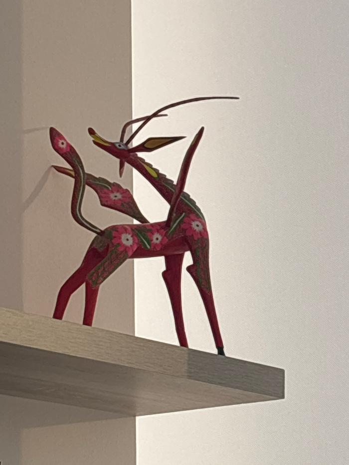 A red wooden deer sculpture with pink flower patterns stands on a white surface. The deer appears to be in motion, with its front legs extended forward and back legs trailing behind. It has long antle…read more
