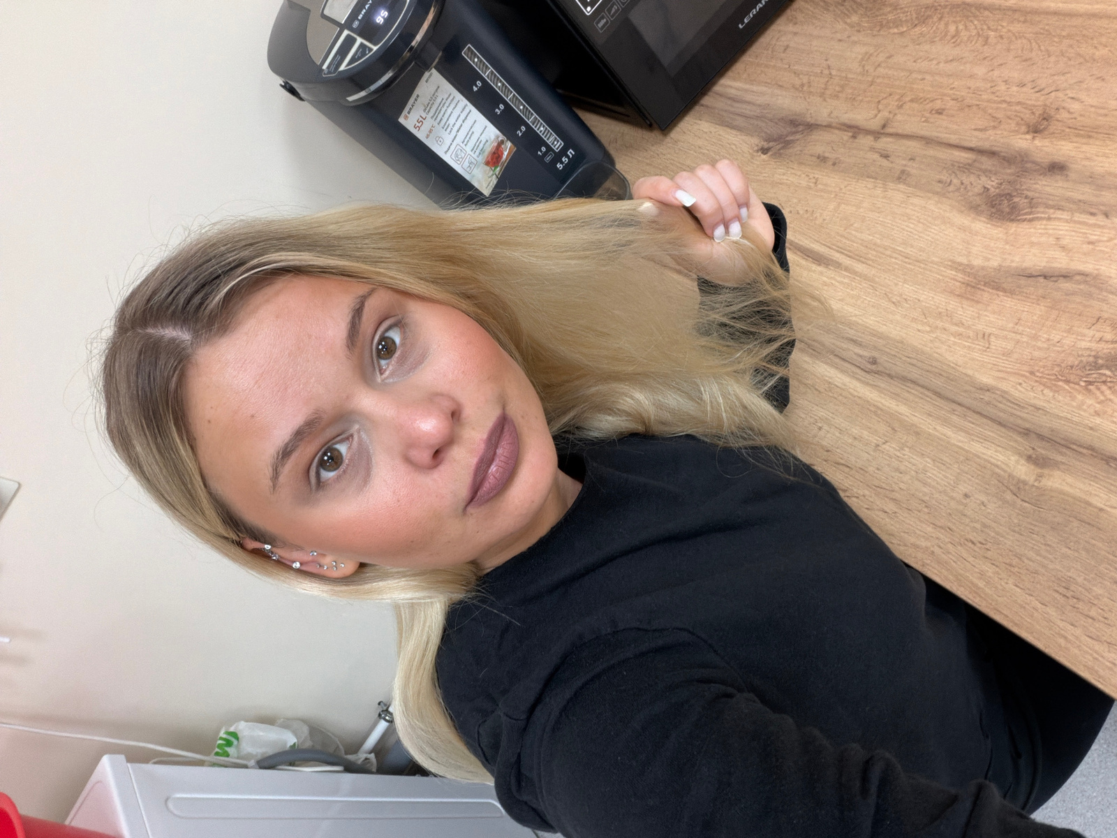 The image shows a fair-skinned young woman with blonde hair, wearing a black long-sleeved shirt. She is looking directly at the camera. Her left ear has multiple piercings. She is sitting at a light-c…read more