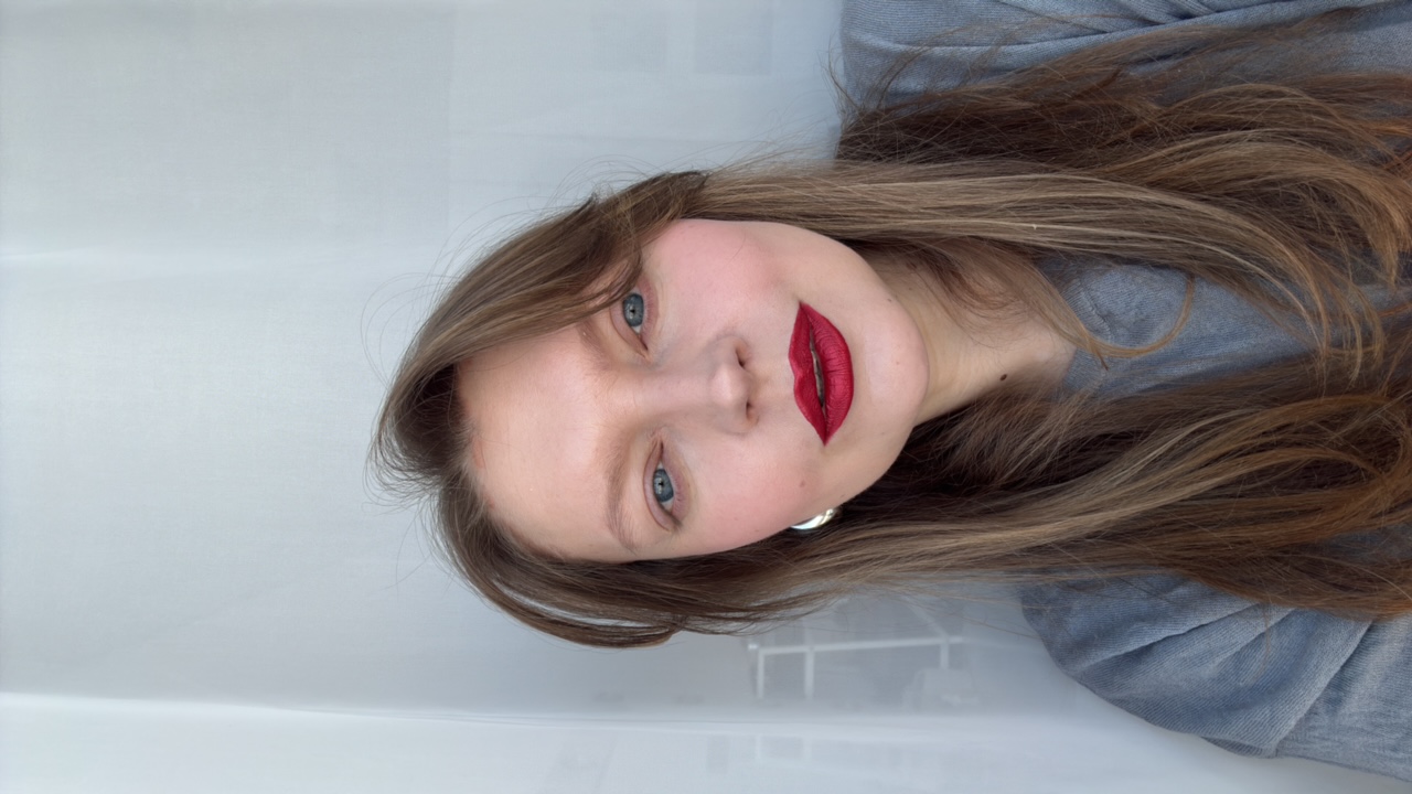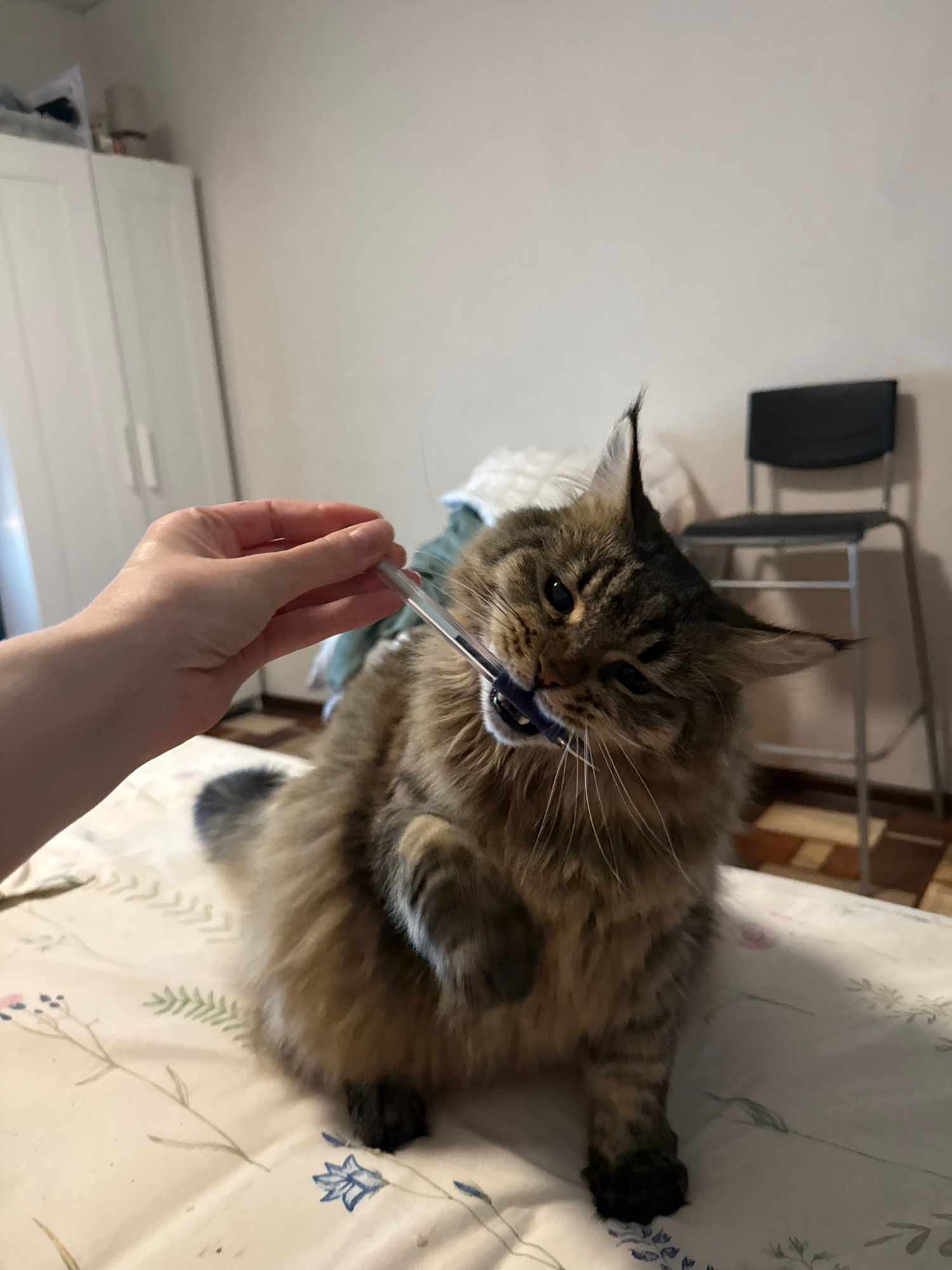A person's hand is holding a clear, blue-tipped object, possibly a pen or similar item, which a fluffy brown tabby cat is biting. The cat is lying on a bed with a floral pattern bedspread. In the back…read more