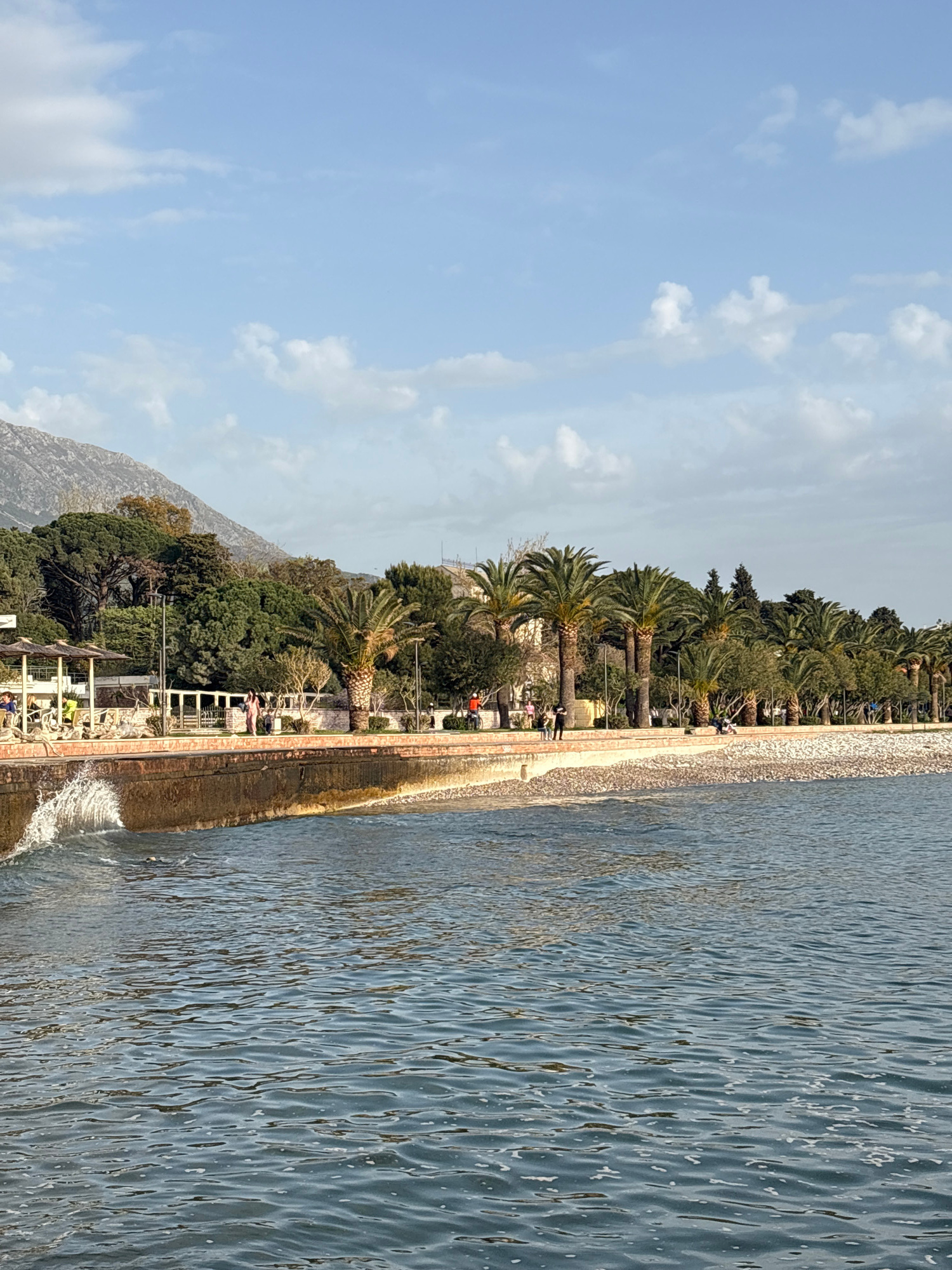 The image depicts a coastline in Bar, Montenegro, with a man-made barrier separating the beach area from the sea. The water is rippled and dark. A raised promenade runs along the coastline, lined with…read more