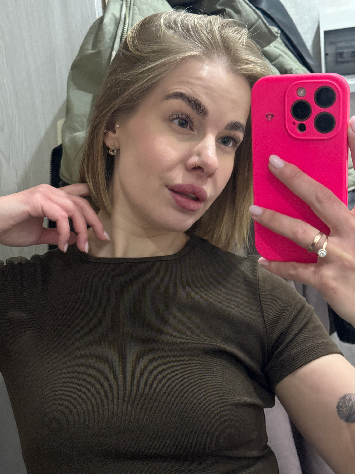 A woman with blonde hair and light skin is holding a pink iPhone in front of her face, presumably taking a selfie. She has light eyebrows, visible makeup, and a nose ring. She is wearing a dark green…read more