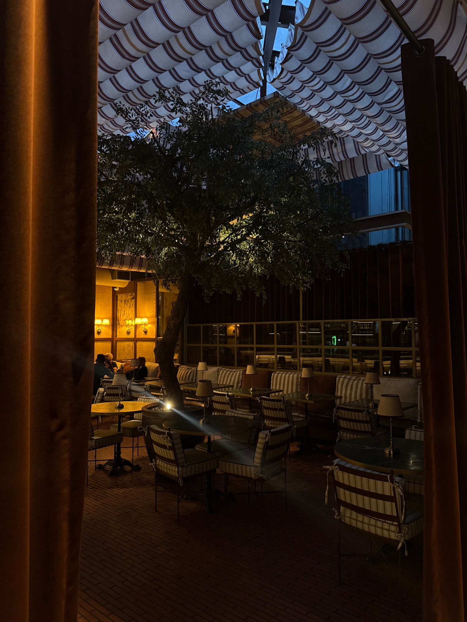 The image depicts an outdoor dining area at night, likely in Cape Town, South Africa, given its architectural style. A large tree dominates the center of the frame, with branches reaching towards stri…read more