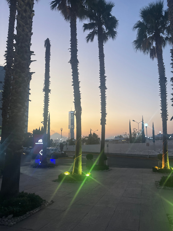 Palm trees line a street, their silhouettes dark against a vibrant sunset sky. The foreground shows a paved walkway. A few buildings and streetlights are visible in the distance, creating a cityscape…read more
